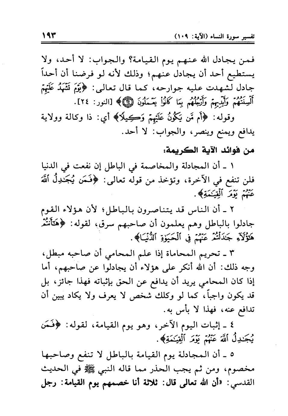 ٣ - تحريم المحاماة إذا علم المحامي أن صاحبه مبطل، وجه ذلك: أن الله أنكر على هؤلاء أن يجادلوا عن صاحبهم، أما إذا كان المحامي يريد أن يدافع عن الحق بإثباته فهذا جائز، بل قد يكون واجبًا، كما لو وكلك شخص لا يعرف ولا يكاد يبين أن تدافع عنه، فهذا لا بأس به.