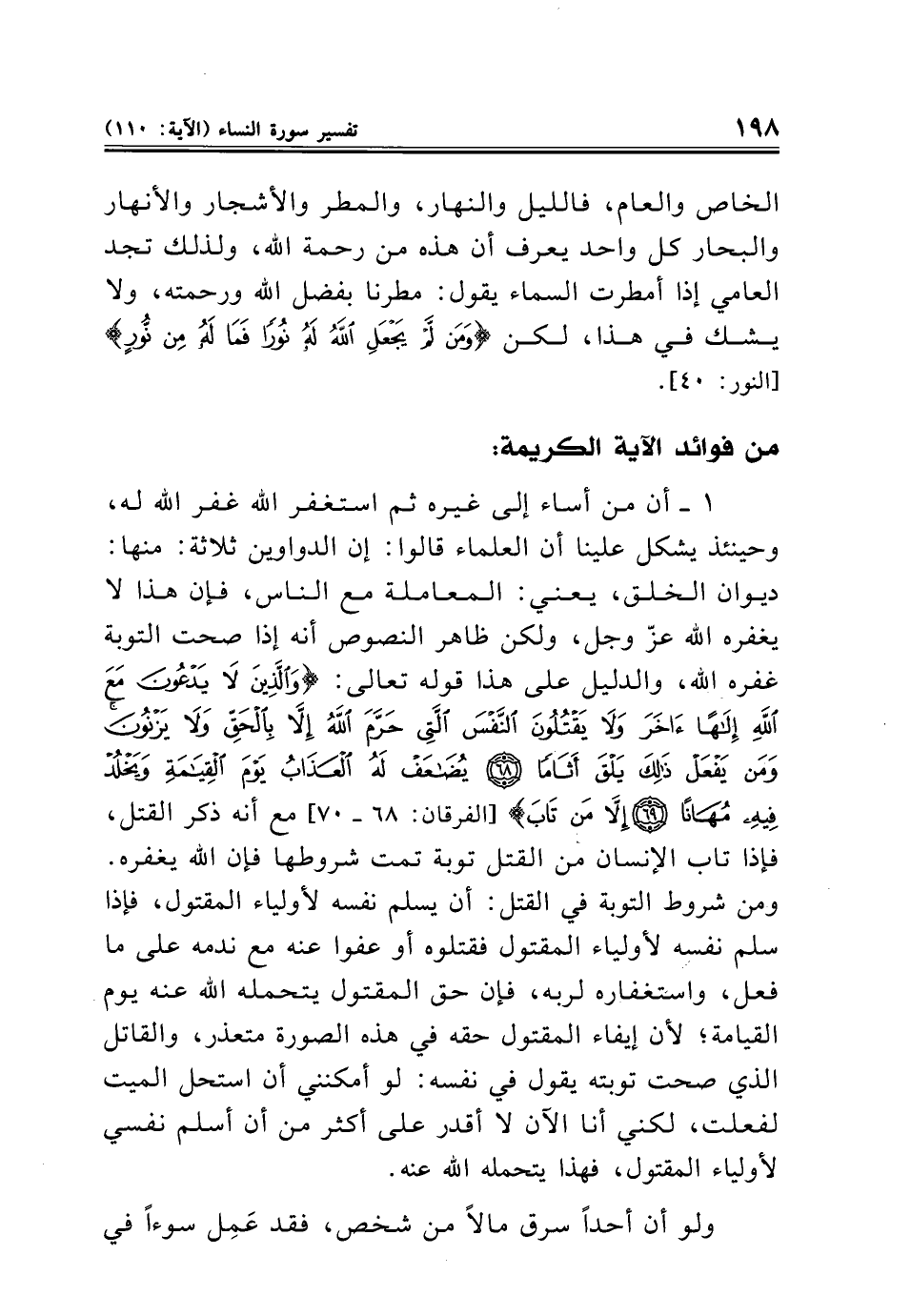 ١ - أن من أساء إلى غيره ثم استغفر الله غفر الله له، وحينئذ يشكل علينا أن العلماء قالوا: إن الدواوين ثلاثة: منها: ديوان الخلق، يعني: المعاملة مع الناس، فإن هذا لا يغفره الله عزّ وجل، ولكن ظاهر النصوص أنه إذا صحت التوبة غفره الله، والدليل على هذا قوله تعالى: {وَالَّذِينَ لَا يَدْعُونَ مَعَ اللَّهِ إِلَهًا آخَرَ وَلَا يَقْتُلُونَ النَّفْسَ الَّتِي حَرَّمَ الله إِلَّا بِالْحَقِّ وَلَا يَزْنُونَ وَمَنْ يَفْعَلْ ذَلِكَ يَلْقَ أَثَامًا (٦٨) يُضَاعَفْ لَهُ الْعَذَابُ يَوْمَ الْقِيَامَةِ وَيَخْلُدْ فِيهِ مُهَانًا (٦٩) إِلَّا مَنْ تَابَ} [الفرقان: ٦٨ - ٧٠] مع أنه ذكر القتل، فإذا تاب الإنسان من القتل توبة تمت شروطها فإن الله يغفره. ومن شروط التوبة في القتل: أن يسلم نفسه لأولياء المقتول، فإذا سلم نفسه لأولياء المقتول فقتلوه أو عفوا عنه مع ندمه على ما فعل، واستغفاره لربه، فإن حق المقتول يتحمله الله عنه يوم القيامة؛ لأن إيفاء المقتول حقه في هذه الصورة متعذر، والقاتل الذي صحت توبته يقول في نفسه: لو أمكنني أن استحل الميت لفعلت، لكني أنا الآن لا أقدر على أكثر من أن أسلم نفسي لأولياء المقتول، فهذا يتحمله الله عنه.