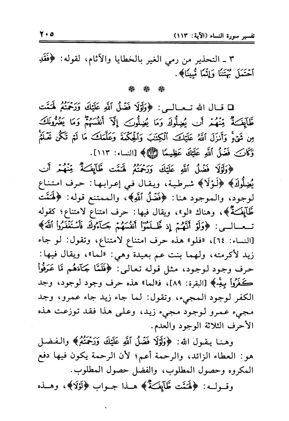 {وَلَوْلَا فَضْلُ اللَّهِ عَلَيْكَ وَرَحْمَتُهُ لَهَمَّتْ طَائِفَةٌ مِنْهُمْ أَنْ يُضِلُّوكَ} {لَوْلَا} شرطية، ويقال في إعرابها: حرف امتناع لوجود، والموجود هنا: {فَضْلُ اللَّهِ}، والممتنع قوله: {لَهَمَّتْ طَائِفَةٌ}، وهناك "لو"، ويقال فيها: حرف امتناع لامتناع؛ كقوله تعالى: {وَلَوْ أَنَّهُمْ إِذْ ظَلَمُوا أَنْفُسَهُمْ جَاءُوكَ فَاسْتَغْفَرُوا اللَّهَ} [النساء: ٦٤]، "فلو" هذه حرف امتناع لامتناع، وتقول: لو جاء زيد لأكرمته، ولهما بنت عم بعيدة وهي: "لما"، ويقال فيها: حرف وجود لوجود، مثل قوله تعالى: {فَلَمَّا جَاءَهُمْ مَا عَرَفُوا كَفَرُوا بِهِ} [البقرة: ٨٩]، فـ "لما" هذه حرف وجود لوجود، وجد الكفر لوجود المجيء، وتقول: لما جاء زيد جاء عمرو، وجد مجيء عمرو لوجود مجيء زيد، وعلى هذا فقد توزعت هذه الأحرف الثلاثة الوجود والعدم.