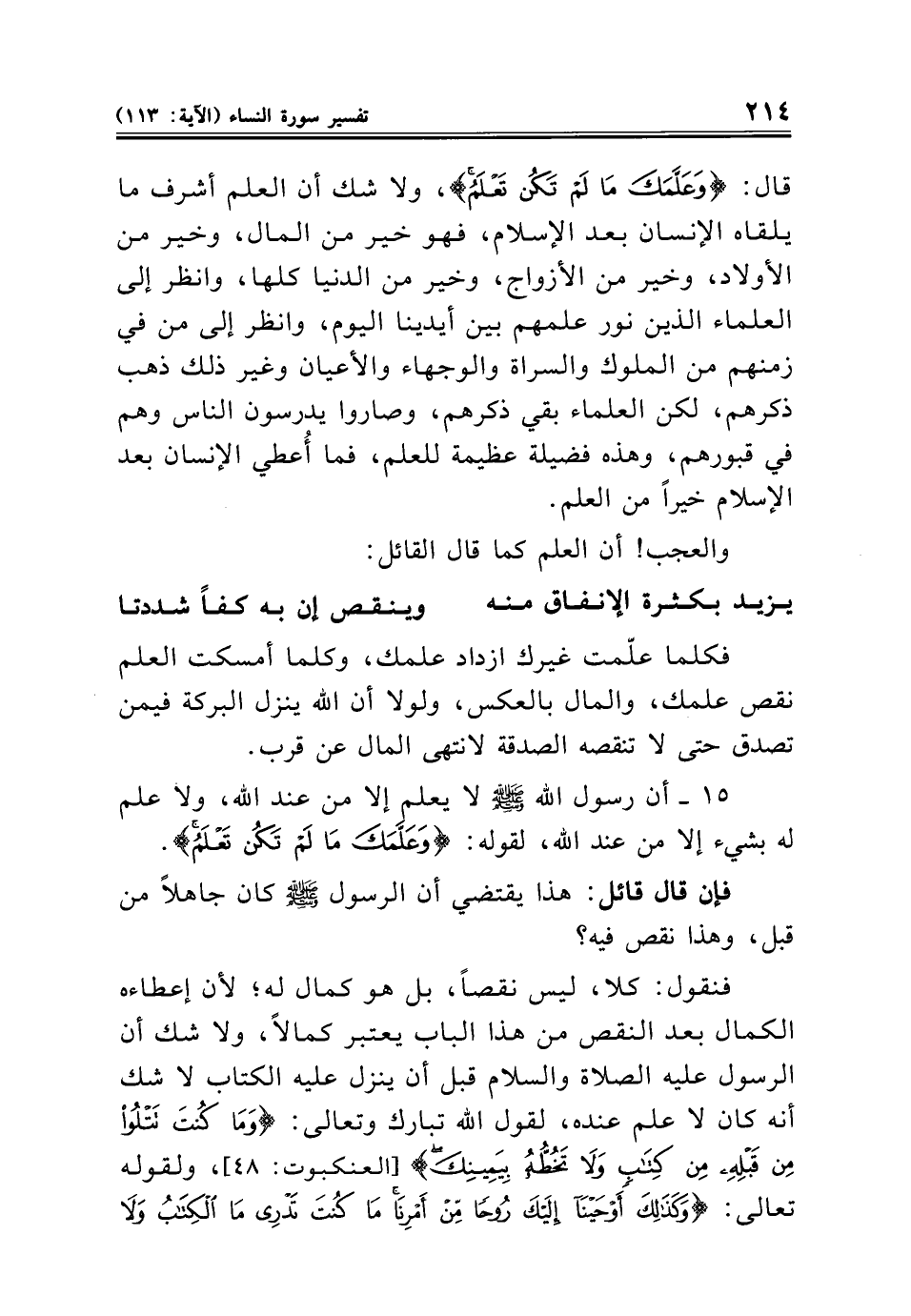 قال: {وَعَلَّمَكَ مَا لَمْ تَكُنْ تَعْلَمُ}، ولا شك أن العلم أشرف ما يلقاه الإنسان بعد الإسلام، فهو خير من المال، وخير من الأولاد، وخير من الأزواج، وخير من الدنيا كلها، وانظر إلى العلماء الذين نور علمهم بين أيدينا اليوم، وانظر إلى من في زمنهم من الملوك والسراة والوجهاء والأعيان وغير ذلك ذهب ذكرهم، لكن العلماء بقي ذكرهم، وصاروا يدرسون الناس وهم في قبورهم، وهذه فضيلة عظيمة للعلم، فما أُعطي الإنسان بعد الإسلام خيرًا من العلم.