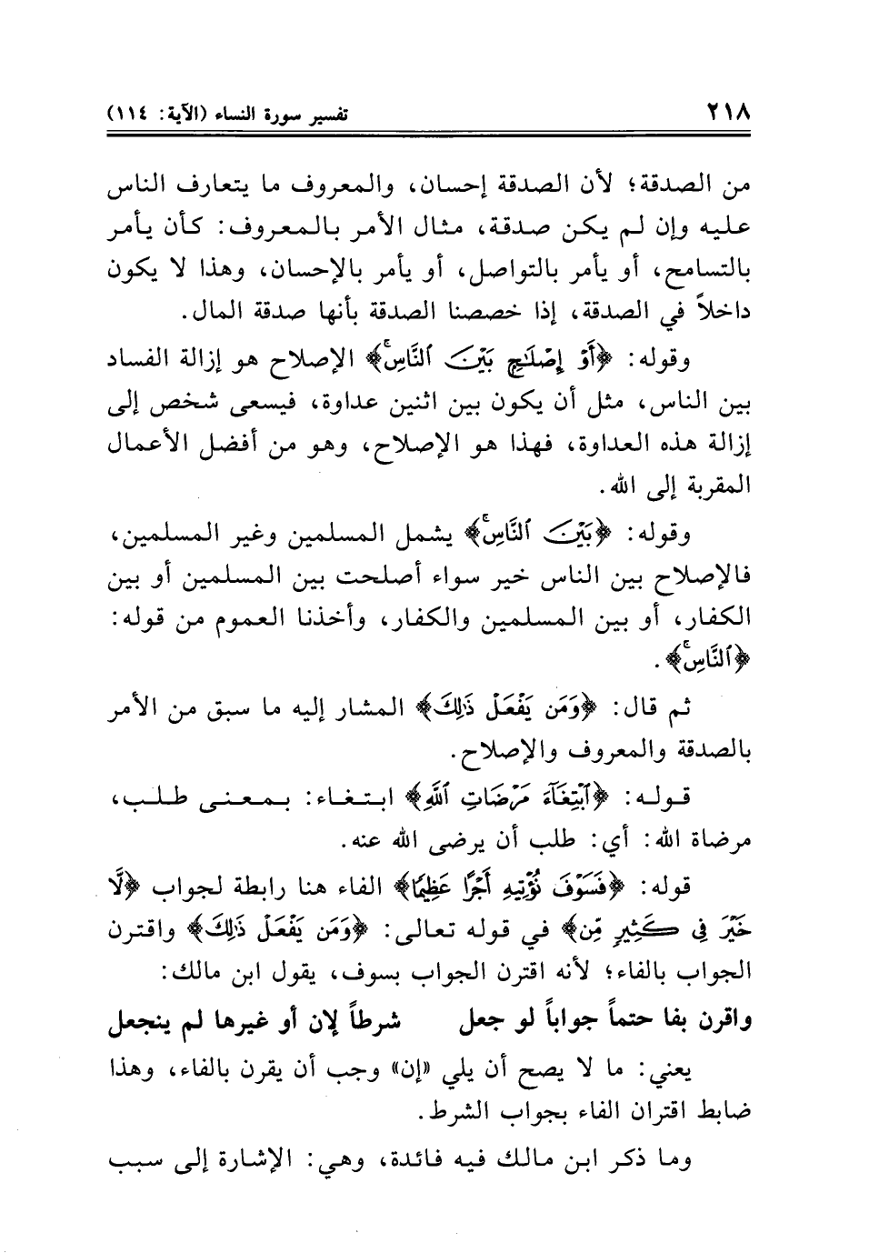 قوله: {فَسَوْفَ نُؤْتِيهِ أَجْرًا عَظِيمًا} الفاء هنا رابطة لجواب {لَا خَيْرَ فِي كَثِيرٍ مِنْ} في قوله تعالى: {وَمَنْ يَفْعَلْ ذَلِكَ} واقترن الجواب بالفاء؛ لأنه اقترن الجواب بسوف، يقول ابن مالك: