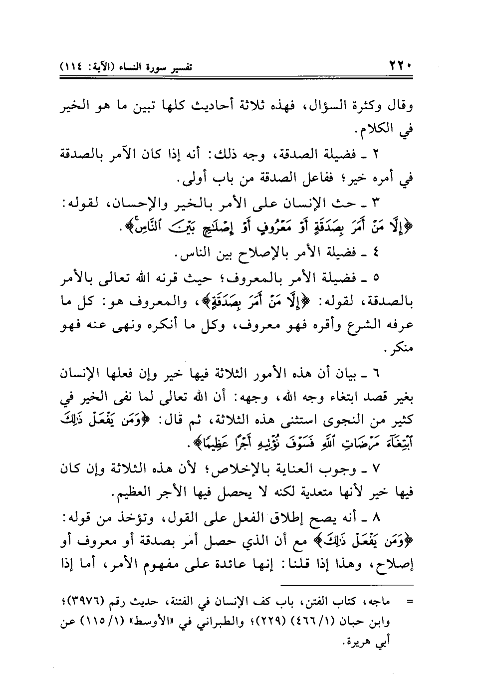 ٦ - بيان أن هذه الأمور الثلاثة فيها خير وإن فعلها الإنسان بغير قصد ابتغاء وجه الله، وجهه: أن الله تعالى لما نفى الخير في كثير من النجوى استثنى هذه الثلاثة، ثم قال: {وَمَنْ يَفْعَلْ ذَلِكَ ابْتِغَاءَ مَرْضَاتِ اللَّهِ فَسَوْفَ نُؤْتِيهِ أَجْرًا عَظِيمًا}.