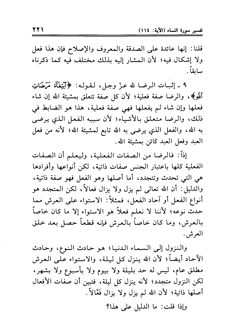 إذًا: فالرضا من الصفات الفعلية، وليعلم أن الصفات الفعلية كلها باعتبار الجنس صفات ذاتية، لكن أنواعها وأفرادها هي التي تحدث وتتجدد، أما أصلها وهو الفعل فهو صفة ذاتية، والدليل: أن الله تعالى لم يزل ولا يزال فعالًا، لكن المتجدد هو أنواع الفعل أو آحاد الفعل، فمثلًا: الإستواء على العرش مما حدث نوعه؛ لأننا لا نعلم فعلًا هو الإستواء إلا ما كان خاصًا بالعرش، وما كان خاصًا بالعرش فإنه قطعًا حصل بعد خلق العرش.
