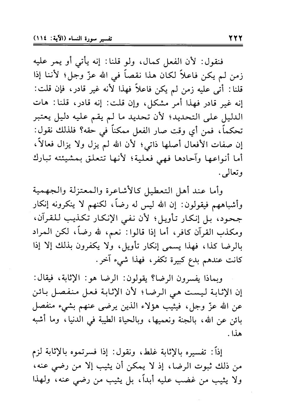 وبماذا يفسرون الرضا؟ يقولون: الرضا هو: الإثابة، فيقال: إن الإثابة ليست هي الرضا؛ لأن الإثابة فعل منفصل بائن عن الله عزّ وجل، فيثيب هؤلاء الذين يرضى عنهم بشيء منفصل بائن عن الله، بالجنة ونعيمها، وبالحياة الطيبة في الدنيا، وما أشبه هذا.