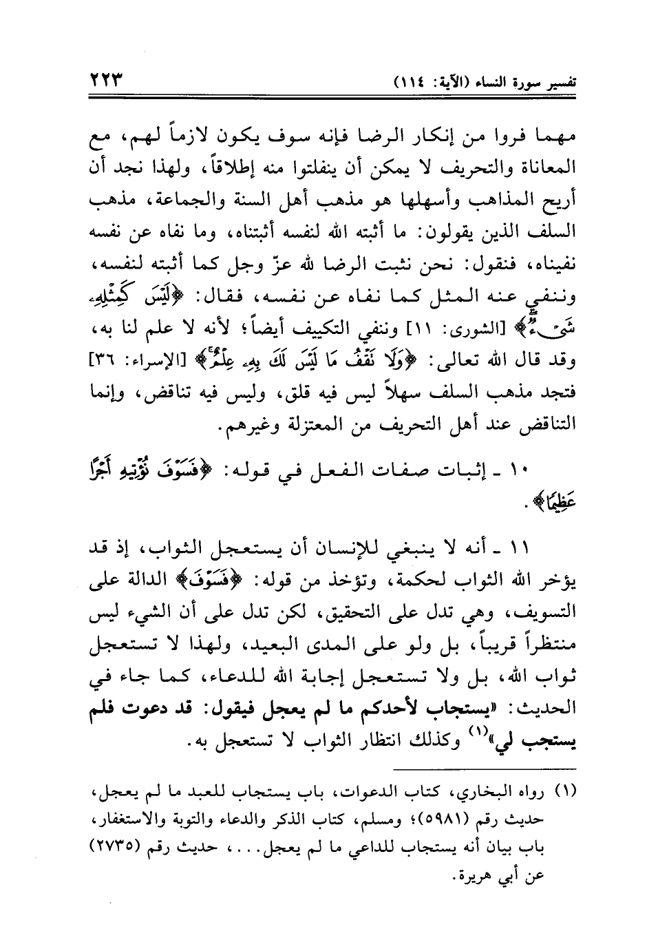 مهما فروا من إنكار الرضا فإنه سوف يكون لازمًا لهم، مع المعاناة والتحريف لا يمكن أن ينفلتوا منه إطلاقًا، ولهذا نجد أن أريح المذاهب وأسهلها هو مذهب أهل السنة والجماعة، مذهب السلف الذين يقولون: ما أثبته الله لنفسه أثبتناه، وما نفاه عن نفسه نفيناه، فنقول: نحن نثبت الرضا لله عزّ وجل كما أثبته لنفسه، وننفي عنه المثل كما نفاه عن نفسه، فقال: {لَيْسَ كَمِثْلِهِ شَيْءٌ} [الشورى: ١١] وننفي التكييف أيضًا؛ لأنه لا علم لنا به، وقد قال الله تعالى: {وَلَا تَقْفُ مَا لَيْسَ لَكَ بِهِ عِلْمٌ} [الإسراء: ٣٦] فتجد مذهب السلف سهلًا ليس فيه قلق، وليس فيه تناقض، وإنما التناقض عند أهل التحريف من المعتزلة وغيرهم.