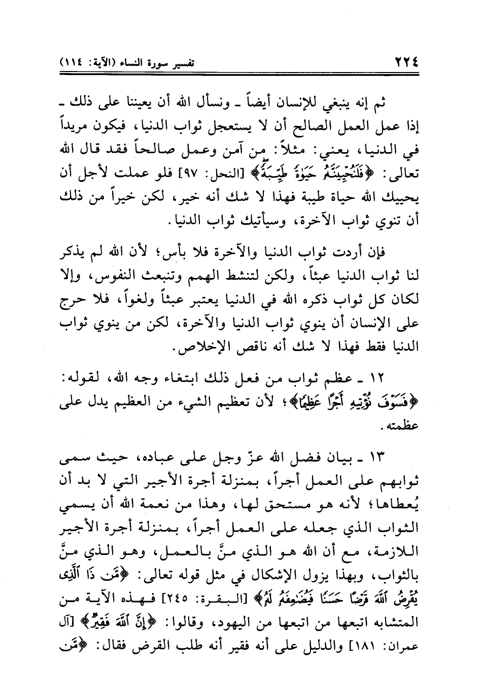 ١٣ - بيان فضل الله عزّ وجل على عباده، حيث سمى ثوابهم على العمل أجرًا، بمنزلة أجرة الأجير التي لا بد أن يُعطاها؛ لأنه هو مستحق لها، وهذا من نعمة الله أن يسمي الثواب الذي جعله على العمل أجرًا، بمنزلة أجرة الأجير اللازمة، مع أن الله هو الذي منَّ بالعمل، وهو الذي منَّ بالثواب، وبهذا يزول الإشكال في مثل قوله تعالى: {مَنْ ذَا الَّذِي يُقْرِضُ اللَّهَ قَرْضًا حَسَنًا فَيُضَاعِفَهُ لَهُ} [البقرة: ٢٤٥] فهذه الآية من المتشابه اتبعها من اتبعها من اليهود، وقالوا: {إِنَّ اللَّهَ فَقِيرٌ} [آل عمران: ١٨١] والدليل على أنه فقير أنه طلب القرض فقال: {مَنْ