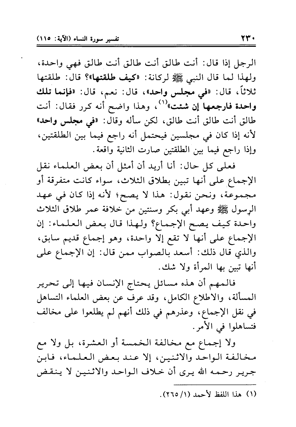 فعلى كل حال: أنا أريد أن أمثل أن بعض العلماء نقل الإجماع على أنها تبين بطلاق الثلاث، سواء كانت متفرقة أو مجموعة، ونحن نقول: هذا لا يصح؛ لأنه إذا كان في عهد الرسول - صلى الله عليه وسلم - وعهد أبي بكر وسنتين من خلافة عمر طلاق الثلاث واحدة كيف يصح الإجماع؟ ولهذا قال بعض العلماء: إن الإجماع على أنها لا تقع إلا واحدة، وهو إجماع قديم سابق، والذي قال ذلك: أسعد بالصواب ممن قال: إن الإجماع على أنها تبين بها المرأة ولا شك.
