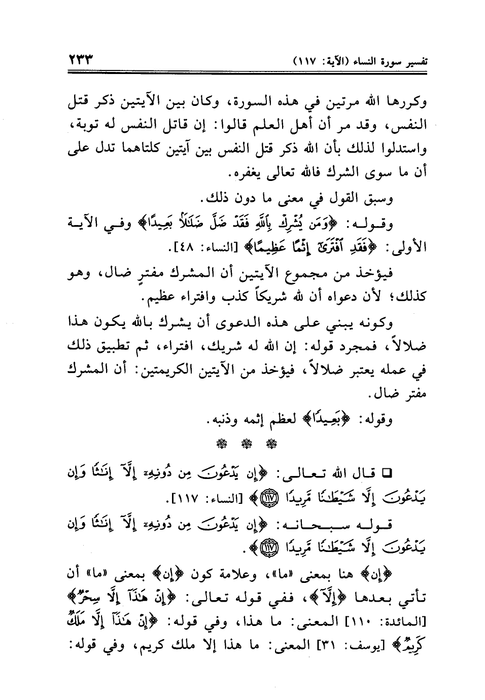 * قال الله تعالى: {إِنْ يَدْعُونَ مِنْ دُونِهِ إِلَّا إِنَاثًا وَإِنْ يَدْعُونَ إِلَّا شَيْطَانًا مَرِيدًا (١١٧)} [النساء: ١١٧].