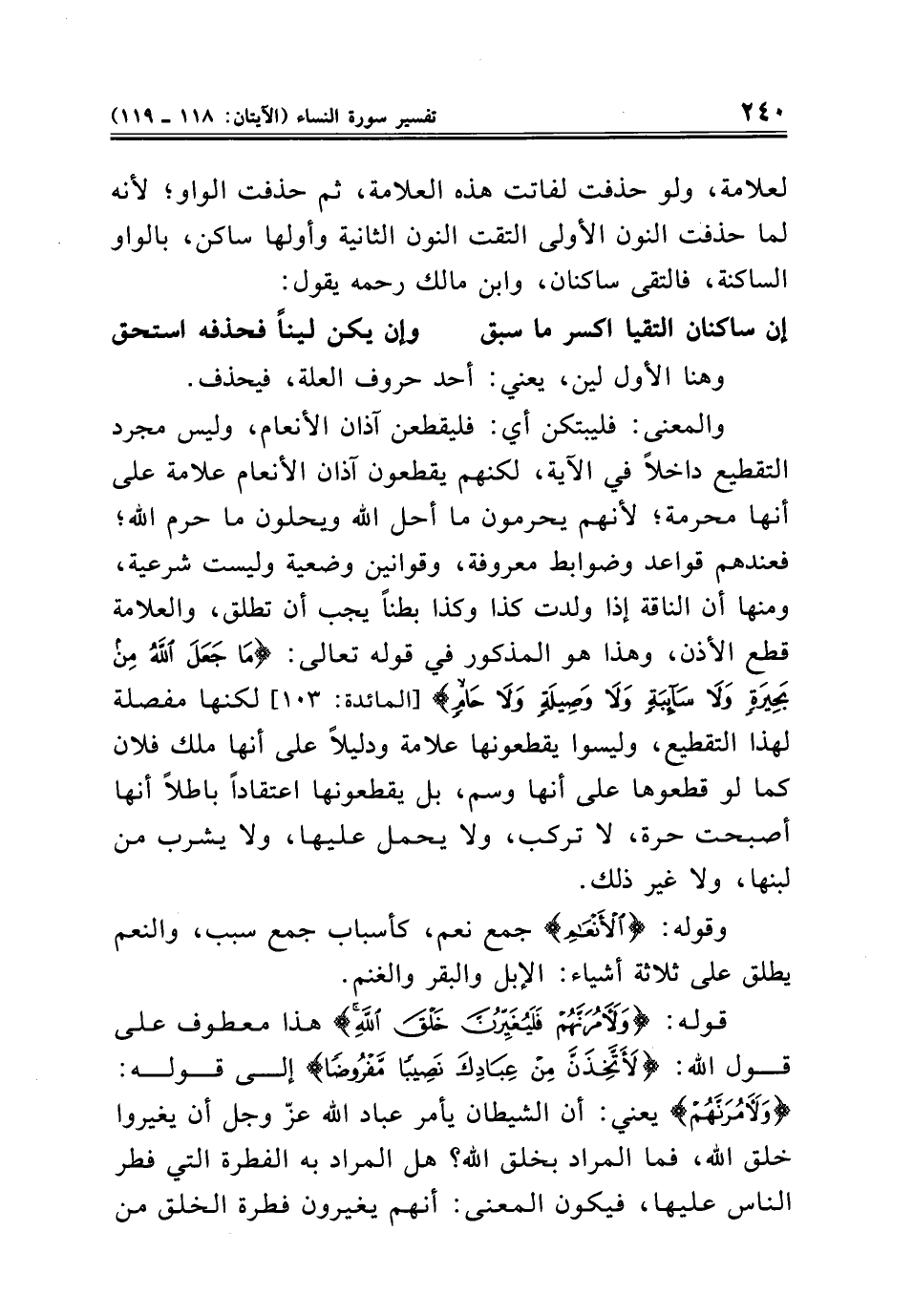 قوله: {وَلَآمُرَنَّهُمْ فَلَيُغَيِّرُنَّ خَلْقَ اللَّهِ} هذا معطوف على قول الله: {لَأَتَّخِذَنَّ مِنْ عِبَادِكَ نَصِيبًا مَفْرُوضًا} إلى قوله: {وَلَآمُرَنَّهُمْ} يعني: أن الشيطان يأمر عباد الله عزّ وجل أن يغيروا خلق الله، فما المراد بخلق الله؟ هل المراد به الفطرة التي فطر الناس عليها، فيكون المعنى: أنهم يغيرون فطرة الخلق من