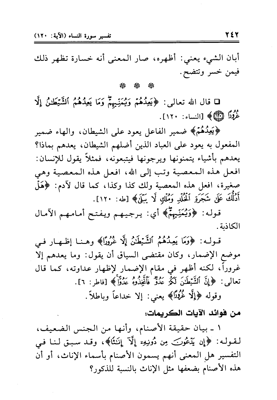 قوله: {وَمَا يَعِدُهُمُ الشَّيْطَانُ إِلَّا غُرُورًا} وهنا إظهار في موضع الإضمار، وكان مقتضى السياق أن يقول: وما يعدهم إلا غرورًا، لكنه أظهر في مقام الإضمار لإظهار عداوته، كما قال تعالى: {إِنَّ الشَّيْطَانَ لَكُمْ عَدُوٌّ فَاتَّخِذُوهُ عَدُوًّا} [فاطر: ٦].