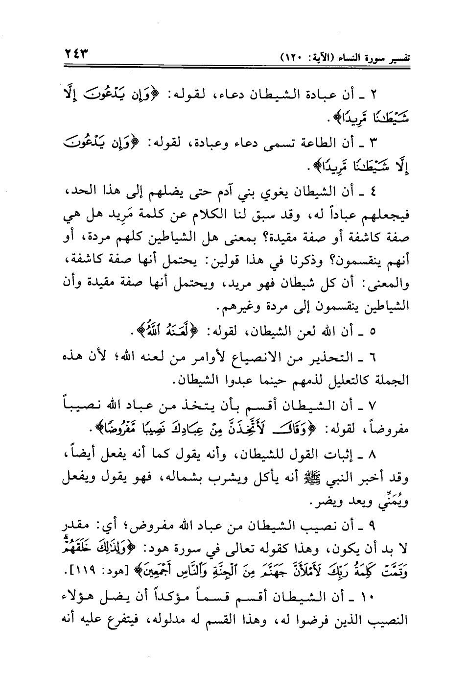 ٩ - أن نصيب الشيطان من عباد الله مفروض؛ أي: مقدر لا بد أن يكون، وهذا كقوله تعالى في سورة هود: {وَلِذَلِكَ خَلَقَهُمْ وَتَمَّتْ كَلِمَةُ رَبِّكَ لَأَمْلَأَنَّ جَهَنَّمَ مِنَ الْجِنَّةِ وَالنَّاسِ أَجْمَعِينَ} [هود: ١١٩].