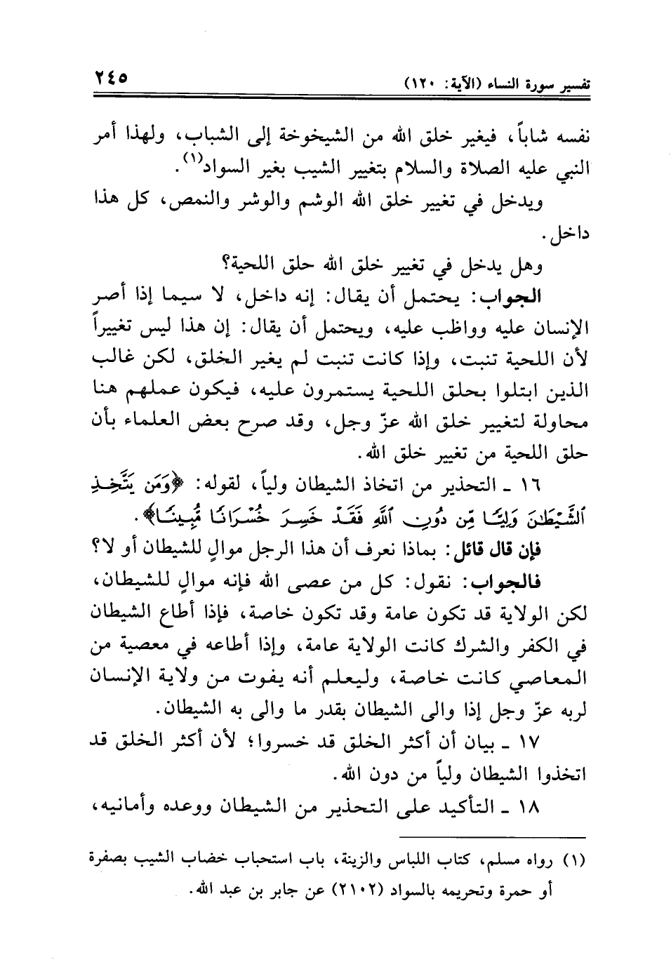 نفسه شابًا، فيغير خلق الله من الشيخوخة إلى الشباب، ولهذا أمر النبي عليه الصلاة والسلام بتغيير الشيب بغير السواد (¬١).