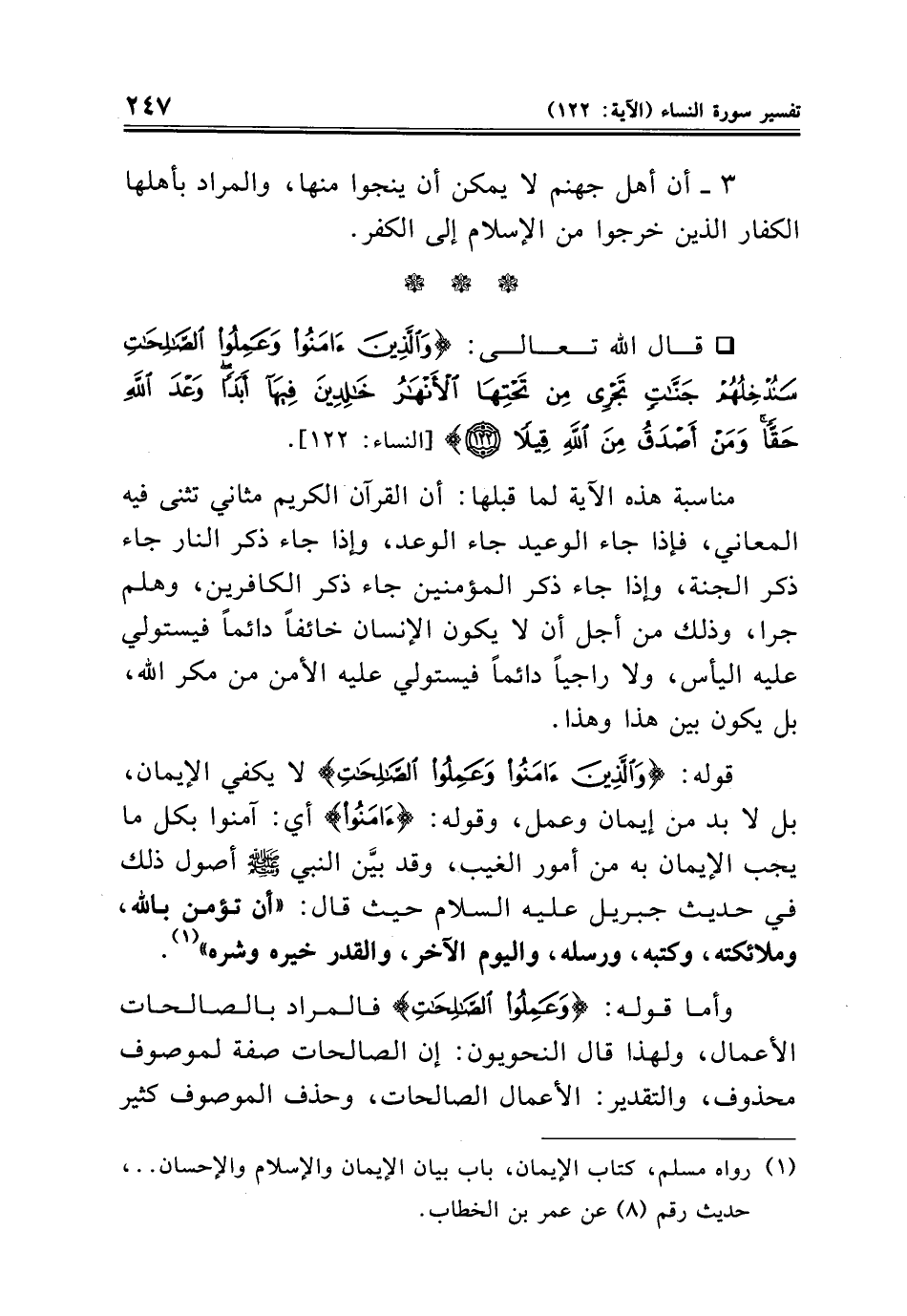 وأما قوله {وَعَمِلُوا الصَّالِحَاتِ} فالمراد بالصالحات الأعمال. ولهذا قال النحويون: إن الصالحات صفة لموصوف محذوف، والتقدير: الأعمال الصالحات، وحذف الموصوف كثير