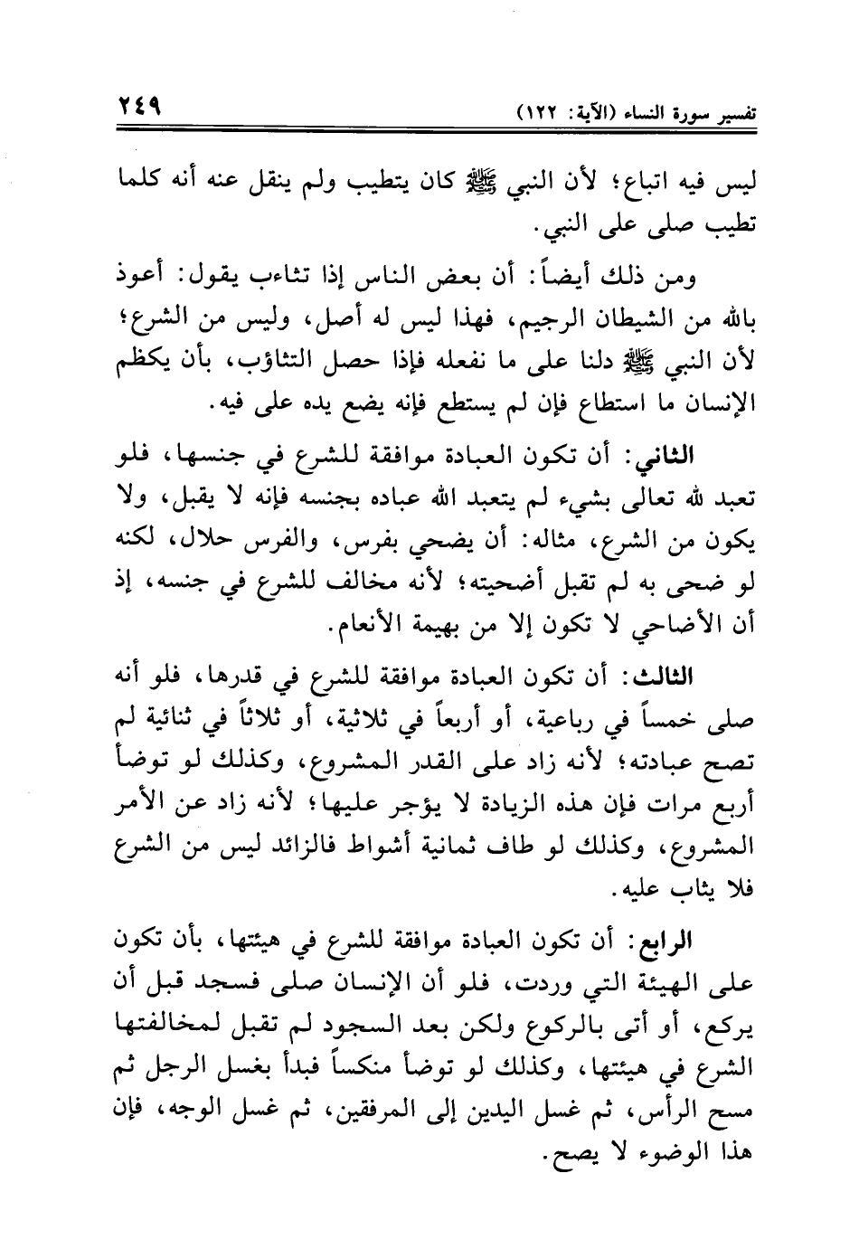 الثالث: أن تكون العبادة موافقة للشرع في قدرها، فلو أنه صلى خمسًا في رباعية، أو أربعًا في ثلاثية، أو ثلاثًا في ثنائية لم تصح عبادته؛ لأنه زاد على القدر المشروع، وكذلك لو توضأ أربع مرات فإن هذه الزيادة لا يؤجر عليها؛ لأنه زاد عن الأمر المشروع، وكذلك لو طاف ثمانية أشواط فالزائد ليس من الشرع فلا يثاب عليه.