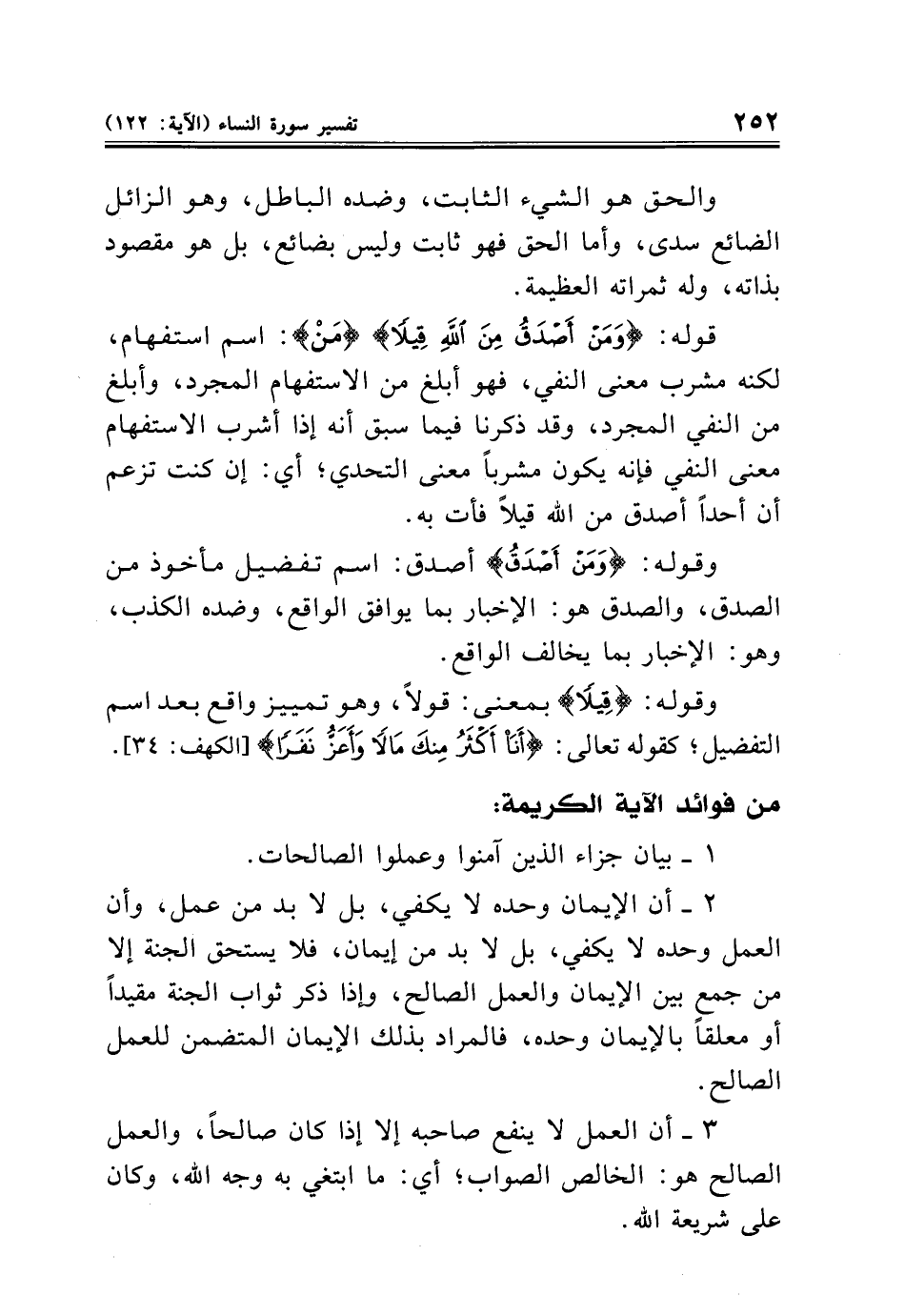 قوله: {وَمَنْ أَصْدَقُ مِنَ اللَّهِ قِيلًا} {مَنْ}: اسم استفهام، لكنه مشرب معنى النفي، فهو أبلغ من الإستفهام المجرد، وأبلغ من النفي المجرد، وقد ذكرنا فيما سبق أنه إذا أشرب الإستفهام معنى النفي فإنه يكون مشربًا معنى التحدي؛ أي: إن كنت تزعم أن أحدًا أصدق من الله قيلًا فأت به.