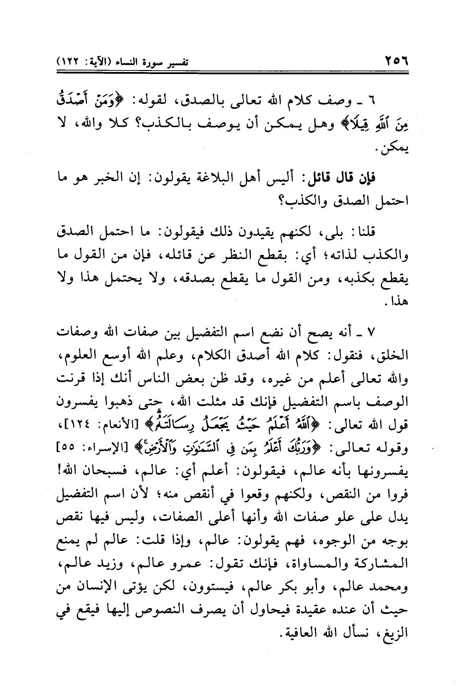 ٦ - وصف كلام الله تعالى بالصدق، لقوله: {وَمَنْ أَصْدَقُ مِنَ اللَّهِ قِيلًا} وهل يمكن أن يوصف بالكذب؟ كلا والله، لا يمكن.