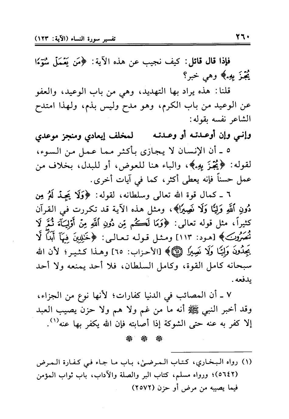 فإذا قال قائل: كيف نجيب عن هذه الآية: {مَنْ يَعْمَلْ سُوءًا يُجْزَ بِهِ} وهي خبر؟