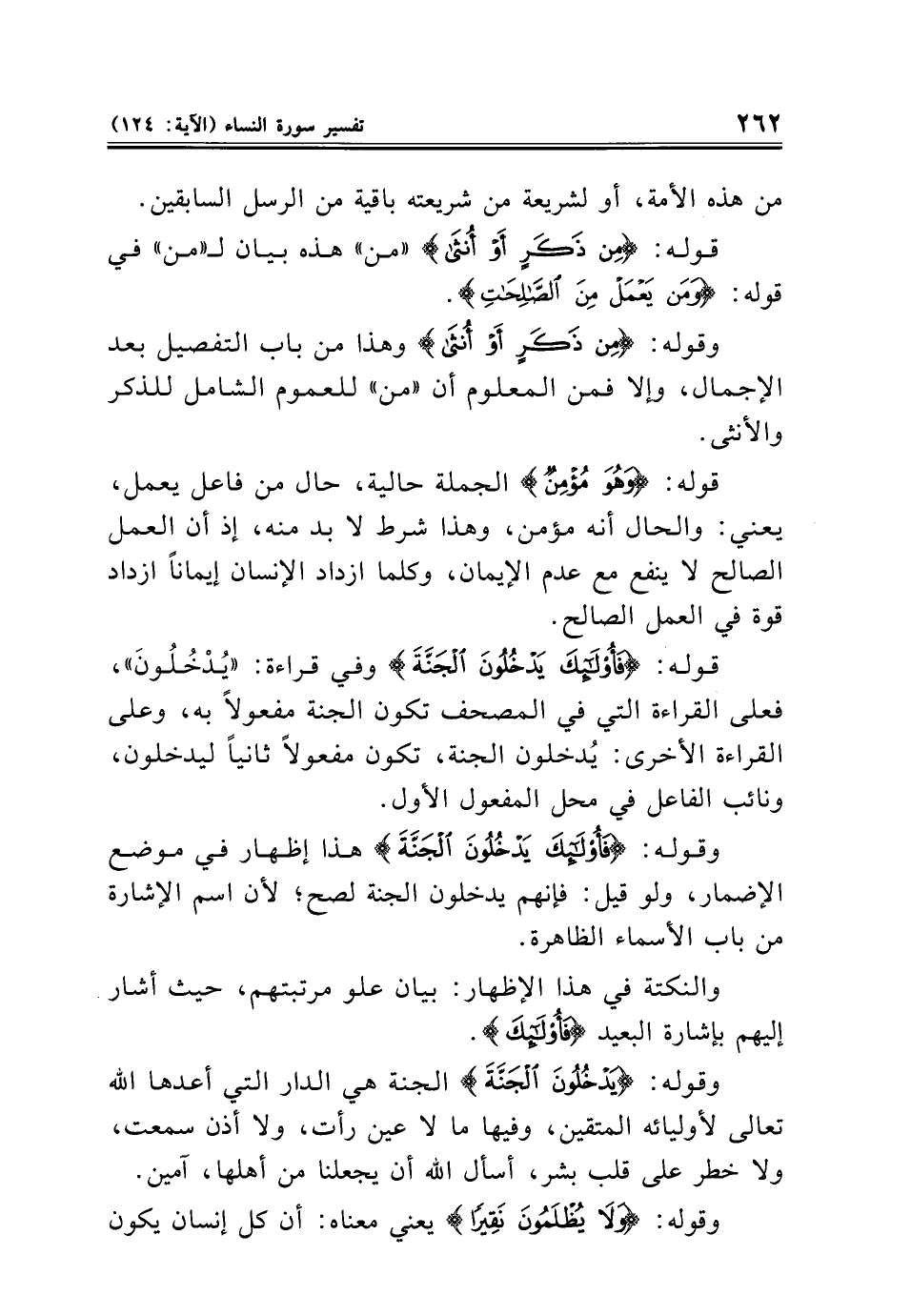 قوله: {مِنْ ذَكَرٍ أَوْ أُنْثَى} "من" هذه بيان لـ "من" في قوله: {وَمَنْ يَعْمَلْ مِنَ الصَّالِحَاتِ}.