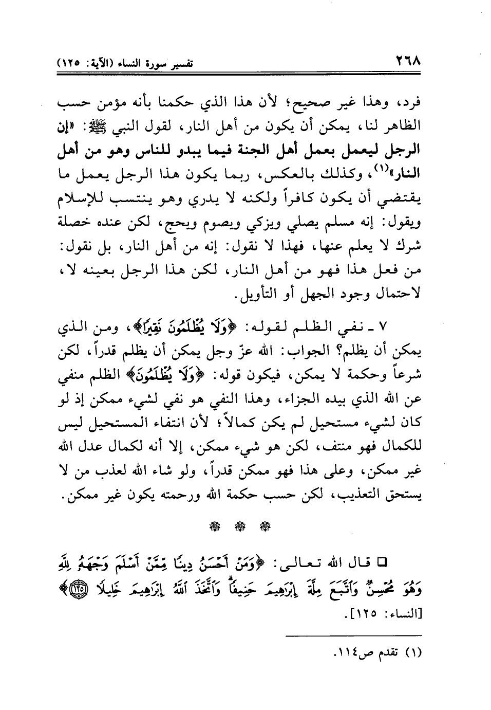 ٧ - نفي الظلم لقوله: {وَلَا يُظْلَمُونَ نَقِيرًا}، ومن الذي يمكن أن يظلم؟ الجواب: الله عزّ وجل يمكن أن يظلم قدرًا، لكن شرعًا وحكمة لا يمكن، فيكون قوله: {وَلَا يُظْلَمُونَ} الظلم منفي عن الله الذي بيده الجزاء، وهذا النفي هو نفي لشيء ممكن إذ لو كان لشيء مستحيل لم يكن كمالًا؛ لأن انتفاء المستحيل ليس للكمال فهو منتف، لكن هو شيء ممكن، إلا أنه لكمال عدل الله غير ممكن، وعلى هذا فهو ممكن قدرًا، ولو شاء الله لعذب من لا يستحق التعذيب، لكن حسب حكمة الله ورحمته يكون غير ممكن.