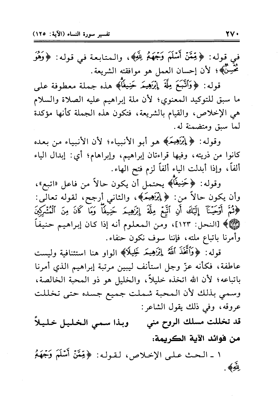 قوله: {وَاتَّخَذَ اللَّهُ إِبْرَاهِيمَ خَلِيلًا} الواو هنا استئنافية وليست عاطفة، فكأنه عزّ وجل استأنف ليبين مرتبة إبراهيم الذي أمرنا باتباعه؛ لأن الله اتخذه خليلًا، والخليل هو ذو المحبة الخالصة، وسمي بذلك لأن المحبة شملت جميع جسده حتى تخللت عروقه، وفي ذلك يقول الشاعر: