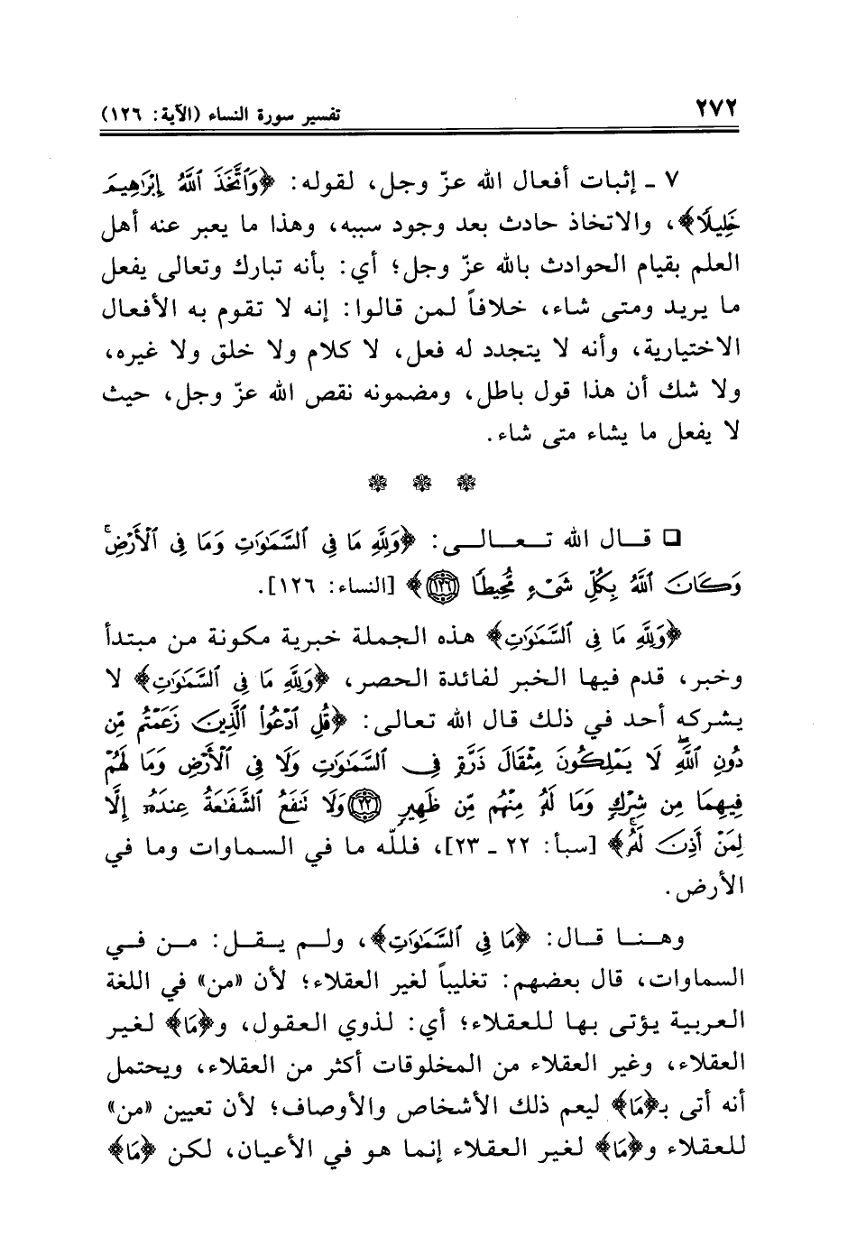 ٧ - إثبات أفعال الله عزّ وجل، لقوله: {وَاتَّخَذَ اللَّهُ إِبْرَاهِيمَ خَلِيلًا}، والإتخاذ حادث بعد وجود سببه، وهذا ما يعبر عنه أهل العلم بقيام الحوادث بالله عزّ وجل؛ أي: بأنه تبارك وتعالى يفعل ما يريد ومتى شاء، خلافًا لمن قالوا: إنه لا تقوم به الأفعال الإختيارية، وأنه لا يتجدد له فعل، لا كلام ولا خلق ولا غيره، ولا شك أن هذا قول باطل، ومضمونه نقص الله عزّ وجل، حيث لا يفعل ما يشاء متى شاء.