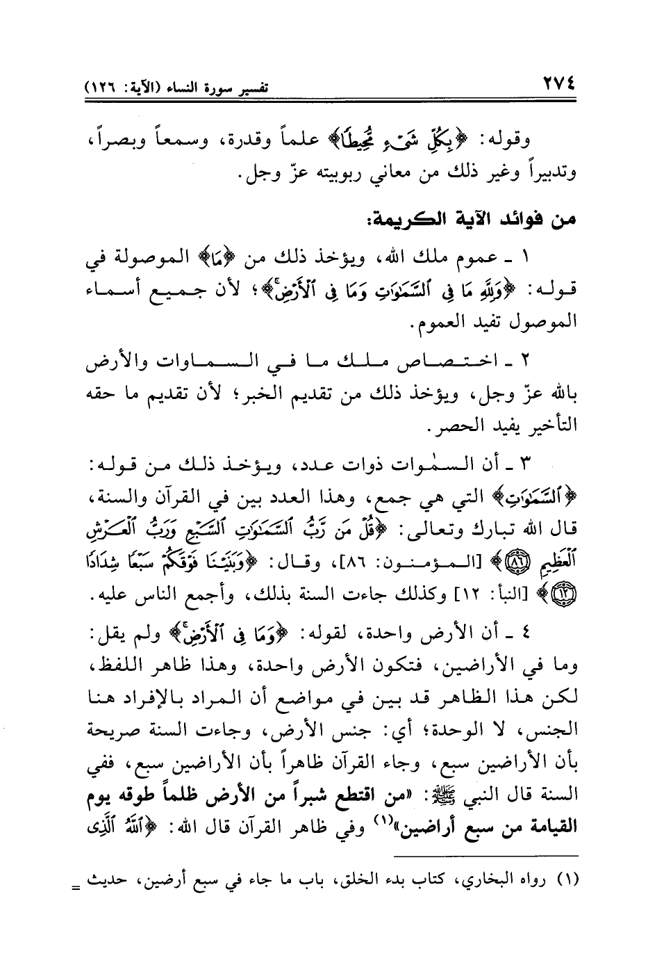 ٤ - أن الأرض واحدة، لقوله: {وَمَا فِي الْأَرْضِ} ولم يقل: وما في الأراضين، فتكون الأرض واحدة، وهذا ظاهر اللفظ، لكن هذا الظاهر قد بين في مواضع أن المراد بالإفراد هنا الجنس، لا الوحدة؛ أي: جنس الأرض، وجاءت السنة صريحة بأن الأراضين سبع، وجاء القرآن ظاهرًا بأن الأراضين سبع، ففي السنة قال النبي - صلى الله عليه وسلم -: "من اقتطع شبرًا من الأرض ظلمًا طوقه يوم القيامة من سبع أراضين" (¬١) وفي ظاهر القرآن قال الله: {اللَّهُ الَّذِي
