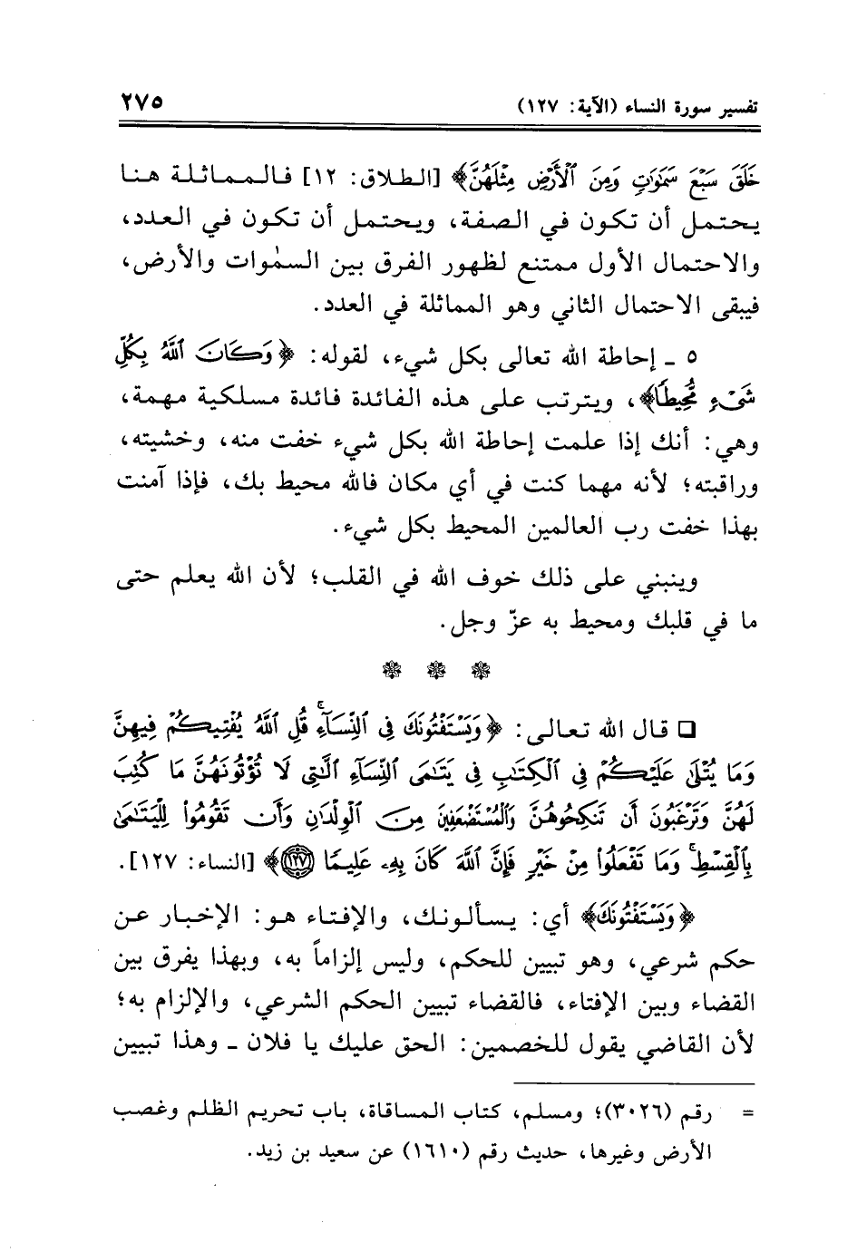 * قال الله تعالى: {وَيَسْتَفْتُونَكَ فِي النِّسَاءِ قُلِ اللَّهُ يُفْتِيكُمْ فِيهِنَّ وَمَا يُتْلَى عَلَيْكُمْ فِي الْكِتَابِ فِي يَتَامَى النِّسَاءِ اللَّاتِي لَا تُؤْتُونَهُنَّ مَا كُتِبَ لَهُنَّ وَتَرْغَبُونَ أَنْ تَنْكِحُوهُنَّ وَالْمُسْتَضْعَفِينَ مِنَ الْوِلْدَانِ وَأَنْ تَقُومُوا لِلْيَتَامَى بِالْقِسْطِ وَمَا تَفْعَلُوا مِنْ خَيْرٍ فَإِنَّ اللَّهَ كَانَ بِهِ عَلِيمًا (١٢٧)} [النساء: ١٢٧].