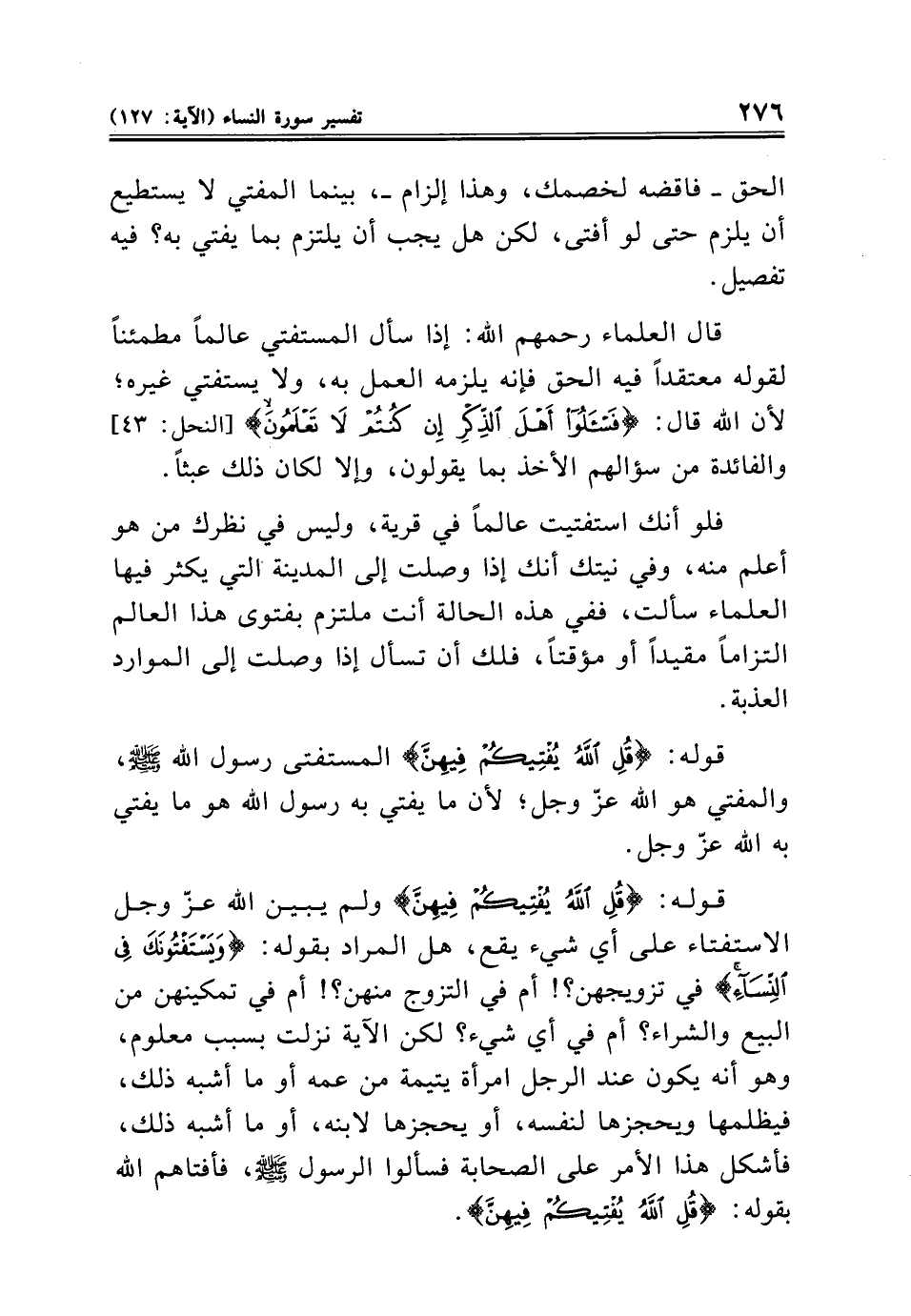 قوله: {قُلِ اللَّهُ يُفْتِيكُمْ فِيهِنَّ} ولم يبين الله عزّ وجل الإستفتاء على أي شيء يقع، هل المراد بقوله: {وَيَسْتَفْتُونَكَ فِي النِّسَاءِ} في تزويجهن؟ ! أم في التزوج منهن؟ ! أم في تمكينهن من البيع والشراء؟ أم في أي شيء؟ لكن الآية نزلت بسبب معلوم، وهو أنه يكون عند الرجل امرأة يتيمة من عمه أو ما أشبه ذلك، فيظلمها ويحجزها لنفسه، أو يحجزها لابنه، أو ما أشبه ذلك، فأشكل هذا الأمر على الصحابة فسألوا الرسول - صلى الله عليه وسلم -، فأفتاهم الله بقوله: {قُلِ اللَّهُ يُفْتِيكُمْ فِيهِنّ}.