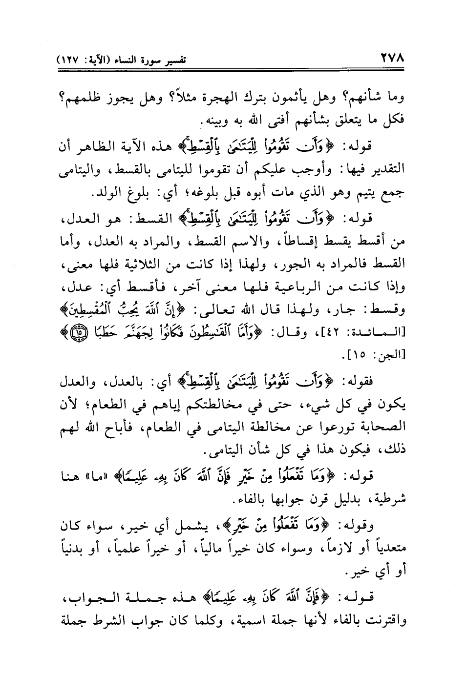 قوله: {وَأَنْ تَقُومُوا لِلْيَتَامَى بِالْقِسْطِ} هذه الآية الظاهر أن التقدير فيها: وأوجب عليكم أن تقوموا لليتامى بالقسط، واليتامى جمع يتيم وهو الذي مات أبوه قبل بلوغه؛ أي: بلوغ الولد.