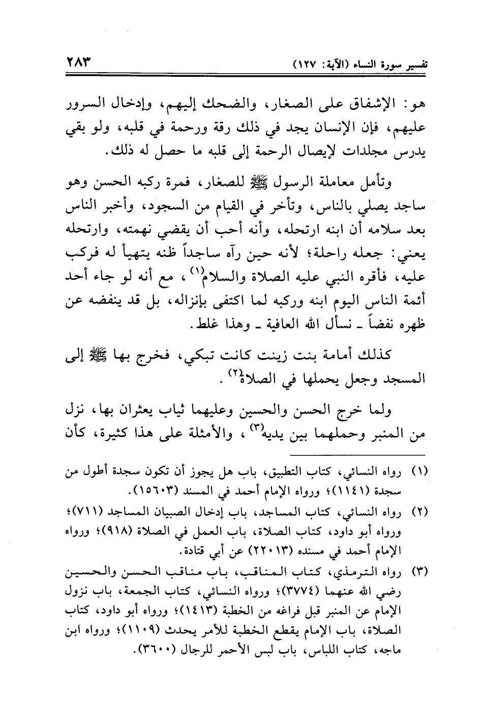 ولما خرج الحسن والحسين وعليهما ثياب يعثران بها، نزل من المنبر وحملهما بين يديه (¬٣)، والأمثلة على هذا كثيرة، كأن