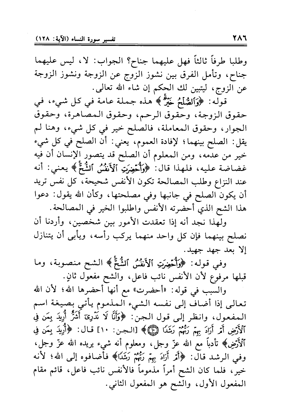قوله: {وَالصُّلْحُ خَيْرٌ} هذه جملة عامة في كل شيء، في حقوق الزوجة، وحقوق الرحم، وحقوق المصاهرة، وحقوق الجوار، وحقوق المعاملة، فالصلح خير في كل شيء، وهنا لم يقل: الصلح بينهما؛ لإفادة العموم، يعني: أن الصلح في كل شيء خير من عدمه، ومن المعلوم أن الصلح قد يتصور الإنسان أن فيه غضاضة عليه، فلهذا قال: {وَأُحْضِرَتِ الْأَنْفُسُ الشُّحَّ} يعني: أنه عند النزاع وطلب المصالحة تكون الأنفس شحيحة، كل نفس تريد أن يكون الصلح في جانبها وفي مصلحتها، وكأن الله يقول: دعوا هذا الشح الذي أحضرته الأنفس واطلبوا الخير في المصالحة.