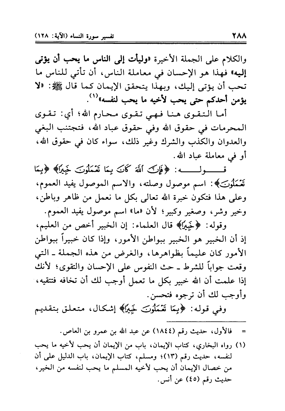 (¬١) رواه البخاري، كتاب الإيمان، باب من الإيمان أن يحب لأخيه ما يحب لنفسه، حديث رقم (١٣)؛ ومسلم، كتاب الإيمان، باب الدليل على أن من خصال الإيمان أن يحب لأخيه المسلم ما يحب لنفسه من الخير، حديث رقم (٤٥) عن أنس.