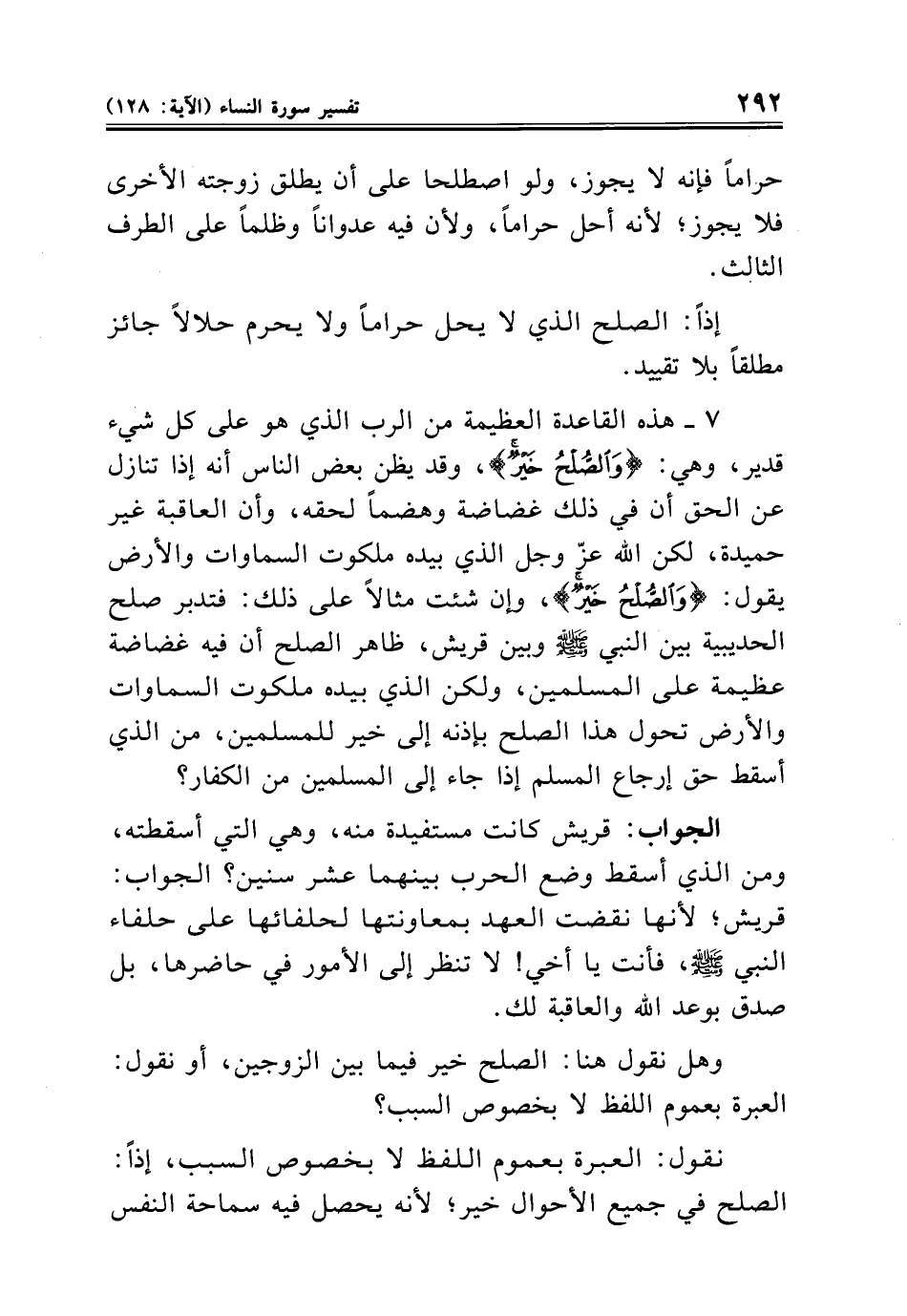 ٧ - هذه القاعدة العظيمة من الرب الذي هو على كل شيء قدير، وهي: {وَالصُّلْحُ خَيْرٌ}، وقد يظن بعض الناس أنه إذا تنازل عن الحق أن في ذلك غضاضة وهضمًا لحقه، وأن العاقبة غير حميدة، لكن الله عزّ وجل الذي بيده ملكوت السماوات والأرض يقول: {وَالصُّلْحُ خَيْرٌ}، وإن شئت مثالًا على ذلك: فتدبر صلح الحديبية بين النبي - صلى الله عليه وسلم - وبين قريش، ظاهر الصلح أن فيه غضاضة عظيمة على المسلمين، ولكن الذي بيده ملكوت السماوات والأرض تحول هذا الصلح بإذنه إلى خير للمسلمين، من الذي أسقط حق إرجاع المسلم إذا جاء إلى المسلمين من الكفار؟