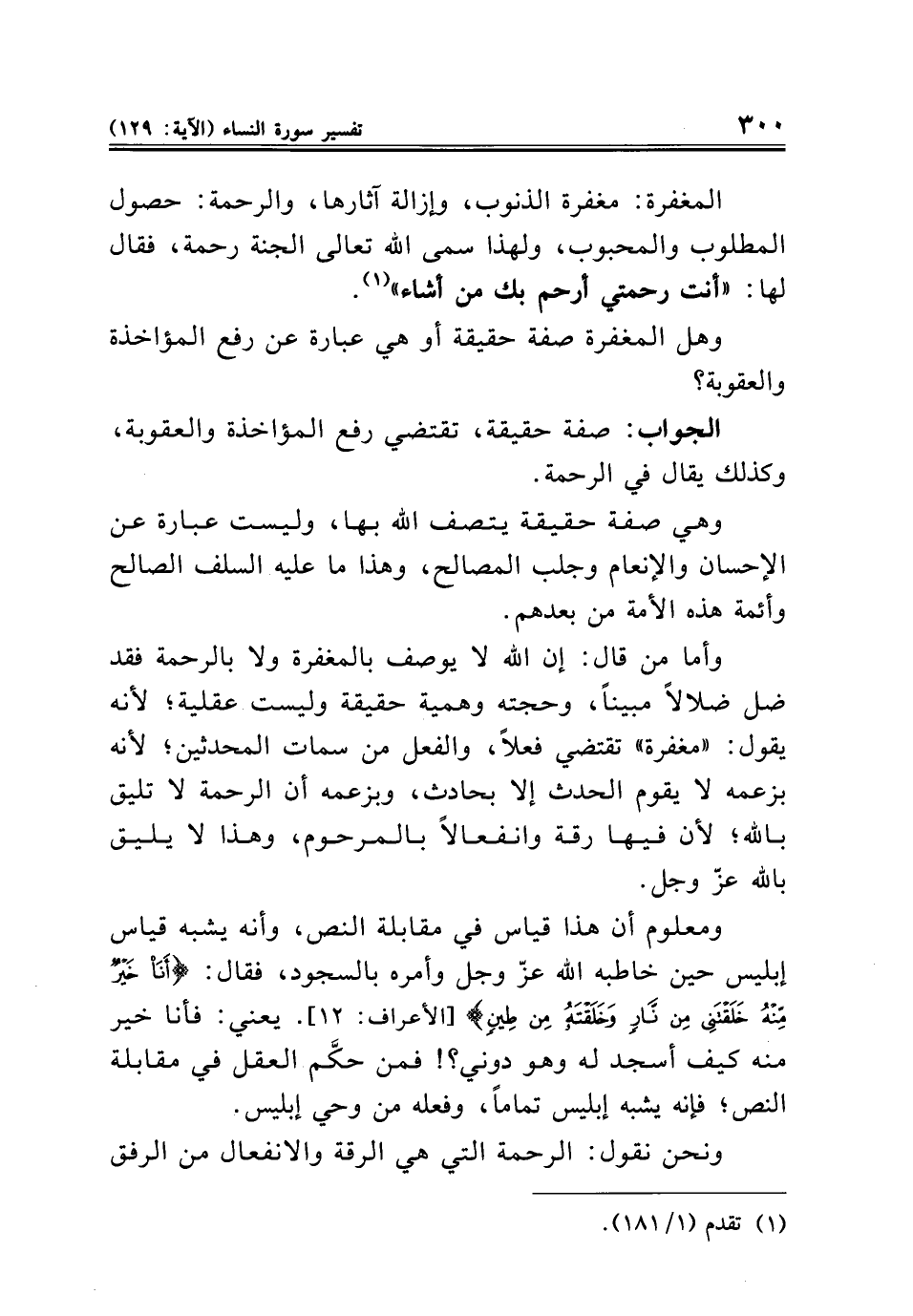 وأما من قال: إن الله لا يوصف بالمغفرة ولا بالرحمة فقد ضل ضلالًا مبينًا، وحجته وهمية حقيقة وليست عقلية؛ لأنه يقول: "مغفرة" تقتضي فعلًا، والفعل من سمات المحدثين؛ لأنه بزعمه لا يقوم الحدث إلا بحادث، وبزعمه أن الرحمة لا تليق بالله؛ لأن فيها رقة وانفعالًا بالمرحوم، وهذا لا يليق بالله عزّ وجل.