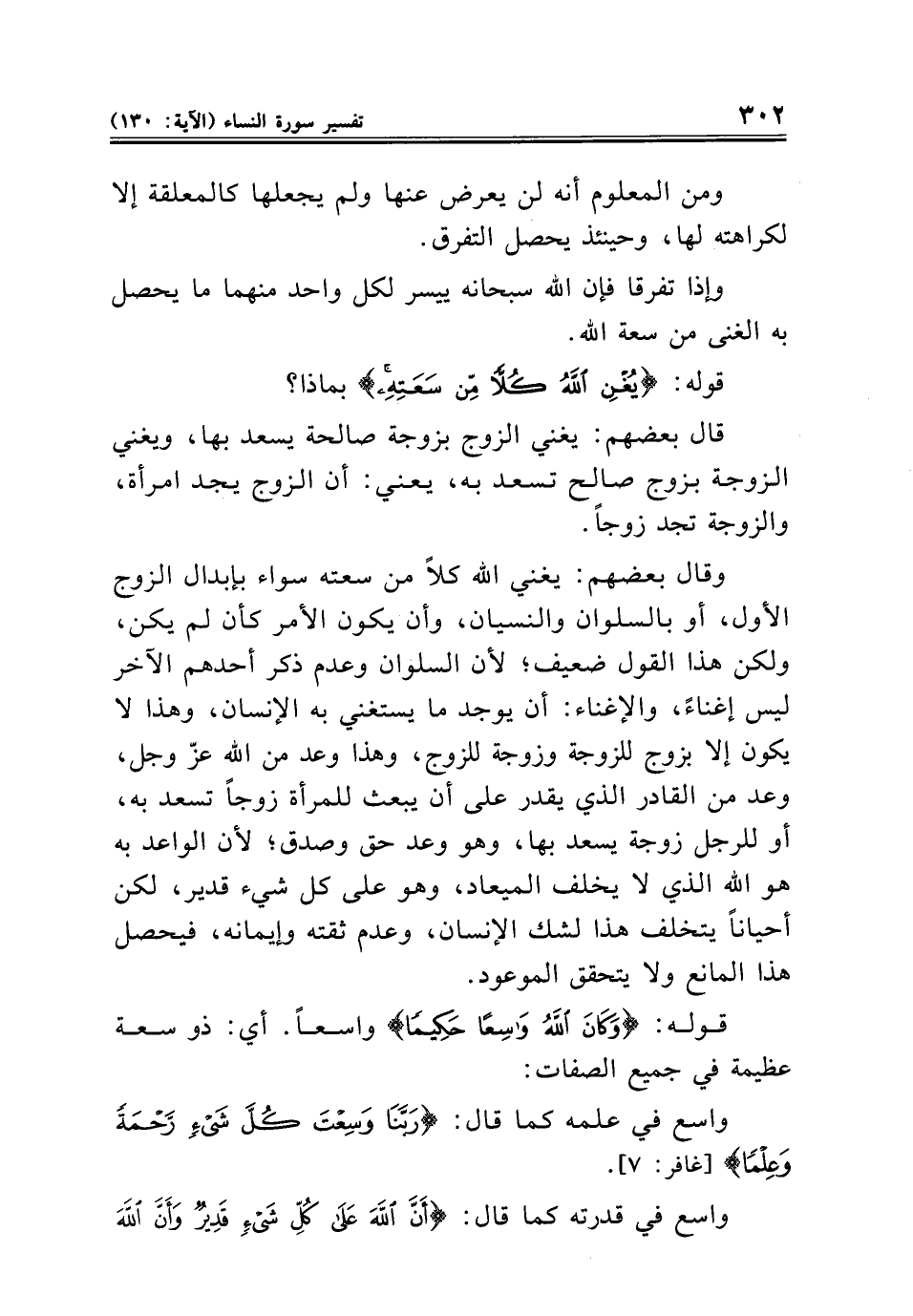 وقال بعضهم: يغني الله كلًا من سعته سواء بإبدال الزوج الأول، أو بالسلوان والنسيان، وأن يكون الأمر كأن لم يكن، ولكن هذا القول ضعيف؛ لأن السلوان وعدم ذكر أحدهم الآخر ليس إغناءً، والإغناء: أن يوجد ما يستغني به الإنسان، وهذا لا يكون إلا بزوج للزوجة وزوجة للزوج، وهذا وعد من الله عزّ وجل، وعد من القادر الذي يقدر على أن يبعث للمرأة زوجًا تسعد به، أو للرجل زوجة يسعد بها، وهو وعد حق وصدق؛ لأن الواعد به هو الله الذي لا يخلف الميعاد، وهو على كل شيء قدير، لكن أحيانًا يتخلف هذا لشك الإنسان، وعدم ثقته وإيمانه، فيحصل هذا المانع ولا يتحقق الموعود.