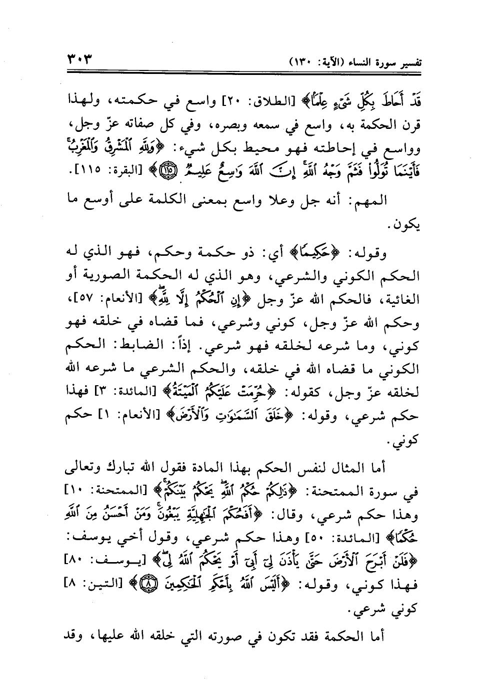 وقوله: {حَكِيمًا} أي: ذو حكمة وحكم، فهو الذي له الحكم الكوني والشرعي، وهو الذي له الحكمة الصورية أو الغائية، فالحكم الله عزّ وجل {إِنِ الْحُكْمُ إِلَّا لِلَّهِ} [الأنعام: ٥٧]، وحكم الله عزّ وجل، كوني وشرعي، فما قضاه في خلقه فهو كوني، وما شرعه لخلقه فهو شرعي. إذًا: الضابط: الحكم الكوني ما قضاه الله في خلقه، والحكم الشرعي ما شرعه الله لخلقه عزّ وجل، كقوله: {حُرِّمَتْ عَلَيْكُمُ الْمَيْتَةُ} [المائدة: ٣] فهذا حكم شرعي، وقوله: {خَلَقَ السَّمَاوَاتِ وَالْأَرْضَ} [الأنعام: ١] حكم كوني.
