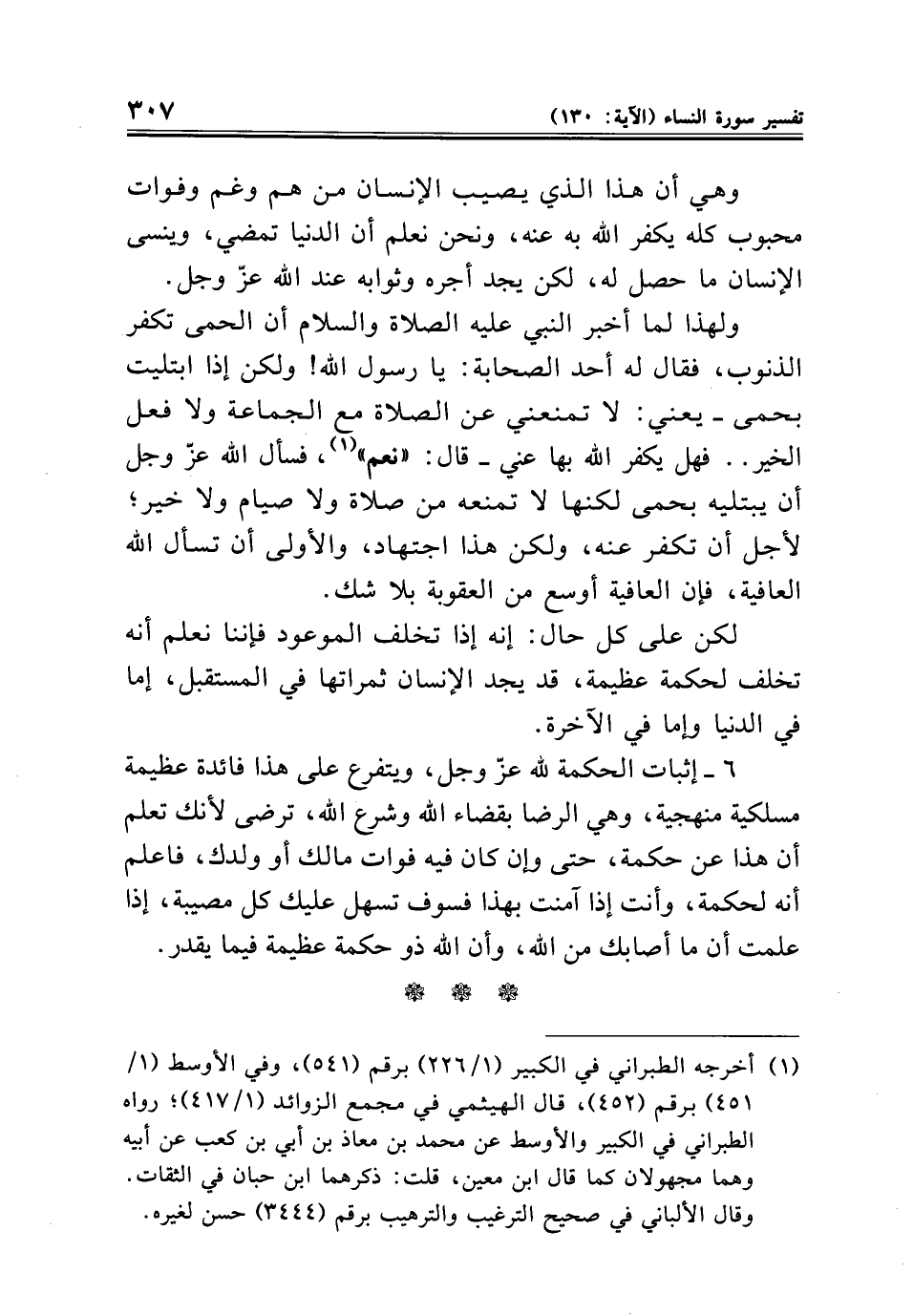 ولهذا لما أخبر النبي عليه الصلاة والسلام أن الحمى تكفر الذنوب، فقال له أحد الصحابة: يا رسول الله! ولكن إذا ابتليت بحمى - يعني: لا تمنعني عن الصلاة مع الجماعة ولا فعل الخير .. فهل يكفر الله بها عني - قال: "نعم" (¬١)، فسأل الله عزّ وجل أن يبتليه بحمى لكنها لا تمنعه من صلاة ولا صيام ولا خير؛ لأجل أن تكفر عنه، ولكن هذا اجتهاد، والأولى أن تسأل الله العافية، فإن العافية أوسع من العقوبة بلا شك.