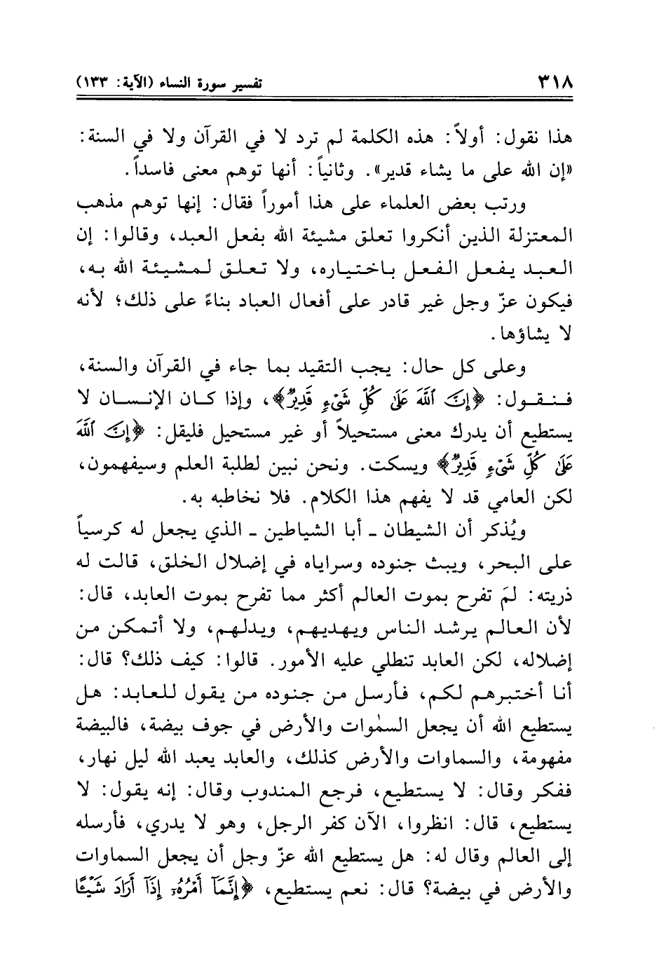 هذا نقول: أولًا: هذه الكلمة لم ترد لا في القرآن ولا في السنة: "إن الله على ما يشاء قدير". وثانيًا: أنها توهم معنى فاسدًا.
