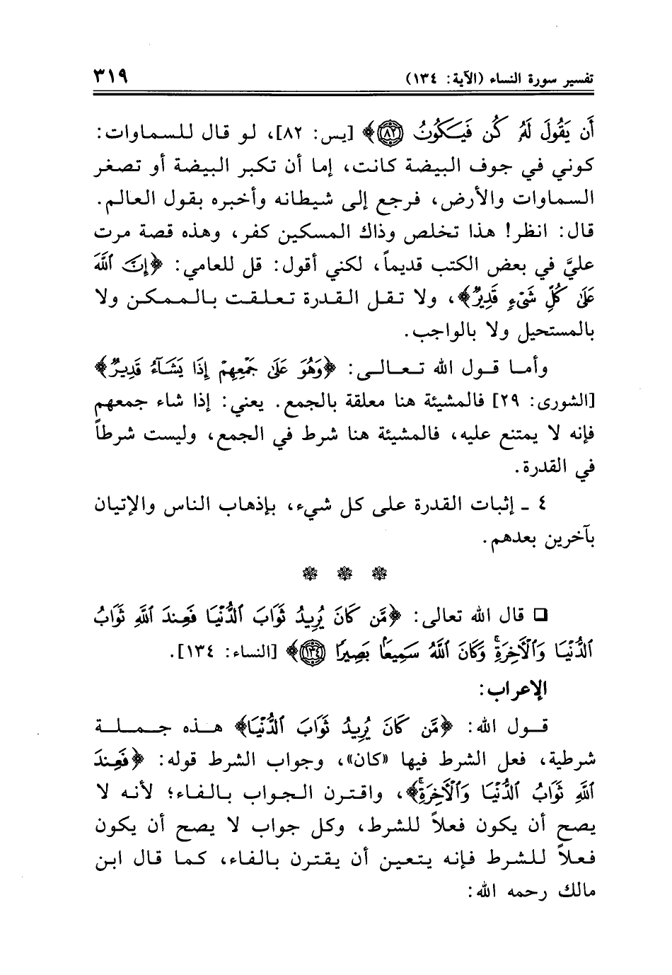 قول الله: {مَنْ كَانَ يُرِيدُ ثَوَابَ الدُّنْيَا} هذه جملة شرطية، فعل الشرط فيها "كان"، وجواب الشرط قوله: {فَعِنْدَ اللَّهِ ثَوَابُ الدُّنْيَا وَالْآخِرَةِ}، واقترن الجواب بالفاء؛ لأنه لا يصح أن يكون فعلًا للشرط، وكل جواب لا يصح أن يكون فعلًا للشرط فإنه يتعين أن يقترن بالفاء، كما قال ابن مالك رحمه الله: