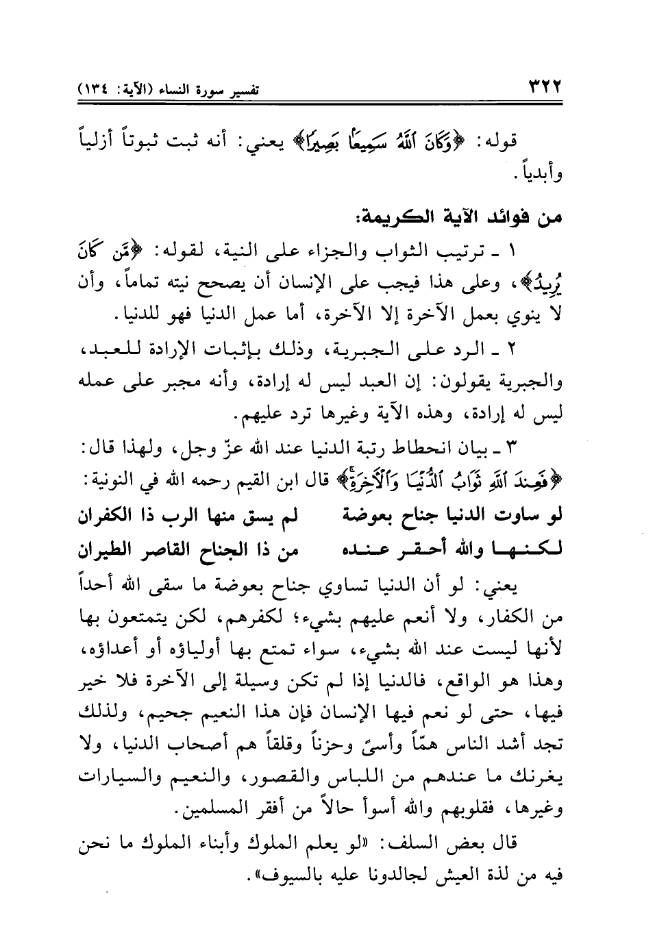 ٣ - بيان انحطاط رتبة الدنيا عند الله عزّ وجل، ولهذا قال: {فَعِنْدَ اللَّهِ ثَوَابُ الدُّنْيَا وَالْآخِرَةِ} قال ابن القيم رحمه الله في النونية: