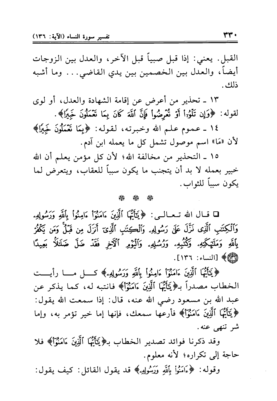 {يَاأَيُّهَا الَّذِينَ آمَنُوا آمِنُوا بِاللَّهِ وَرَسُولِهِ} كل ما رأيت الخطاب مصدرًا بـ {يَاأَيُّهَا الَّذِينَ آمَنُوا} فانتبه له، كما يذكر عن عبد الله بن مسعود - رضي الله عنه -، قال: إذا سمعت الله يقول: {يَاأَيُّهَا الَّذِينَ آمَنُوا} فأرعها سمعك، فإنها إما خير تؤمر به، وإما شر تنهى عنه.
