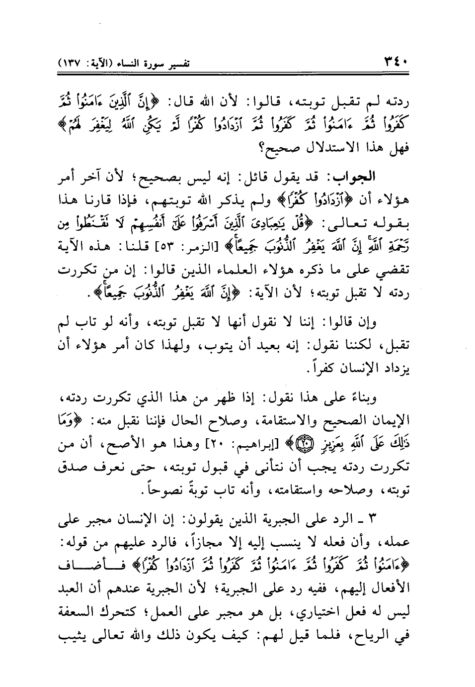 الجواب: قد يقول قائل: إنه ليس بصحيح؛ لأن آخر أمر هؤلاء أن {ازْدَادُوا كُفْرًا} ولم يذكر الله توبتهم، فإذا قارنا هذا بقوله تعالى: {قُلْ يَاعِبَادِيَ الَّذِينَ أَسْرَفُوا عَلَى أَنْفُسِهِمْ لَا تَقْنَطُوا مِنْ رَحْمَةِ اللَّهِ إِنَّ اللَّهَ يَغْفِرُ الذُّنُوبَ جَمِيعًا} [الزمر: ٥٣] قلنا: هذه الآية تقضي على ما ذكره هؤلاء العلماء الذين قالوا: إن من تكررت ردته لا تقبل توبته؛ لأن الآية: {إِنَّ اللَّهَ يَغْفِرُ الذُّنُوبَ جَمِيعًا}.