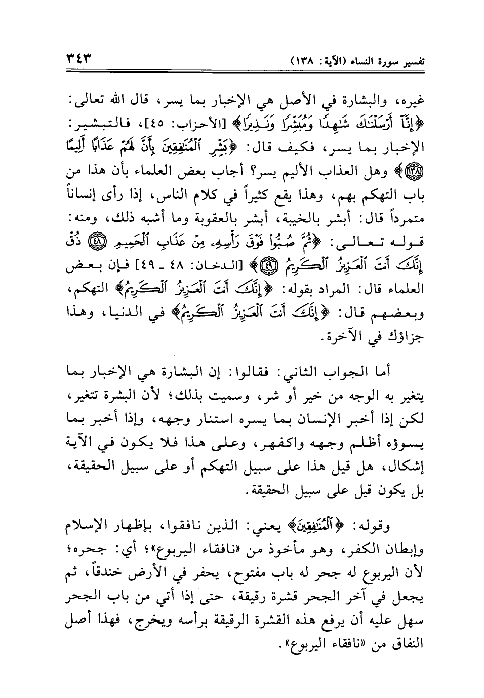غيره، والبشارة في الأصل هي الإخبار بما يسر، قال الله تعالى: {إِنَّا أَرْسَلْنَاكَ شَاهِدًا وَمُبَشِّرًا وَنَذِيرًا} [الأحزاب: ٤٥]، فالتبشير: الإخبار بما يسر، فكيف قال: {بَشِّرِ الْمُنَافِقِينَ بِأَنَّ لَهُمْ عَذَابًا أَلِيمًا (١٣٨)} وهل العذاب الأليم يسر؟ أجاب بعض العلماء بأن هذا من باب التهكم بهم، وهذا يقع كثيرًا في كلام الناس، إذا رأى إنسانًا متمردًا قال: أبشر بالخيبة، أبشر بالعقوبة وما أشبه ذلك، ومنه: قوله تعالى: {ثُمَّ صُبُّوا فَوْقَ رَأْسِهِ مِنْ عَذَابِ الْحَمِيمِ (٤٨) ذُقْ إِنَّكَ أَنْتَ الْعَزِيزُ الْكَرِيمُ (٤٩)} [الدخان: ٤٨ - ٤٩] فإن بعض العلماء قال: المراد بقوله: {إِنَّكَ أَنْتَ الْعَزِيزُ الْكَرِيمُ} التهكم، وبعضهم قال: {إِنَّكَ أَنْتَ الْعَزِيزُ الْكَرِيمُ} في الدنيا، وهذا جزاؤك في الآخرة.