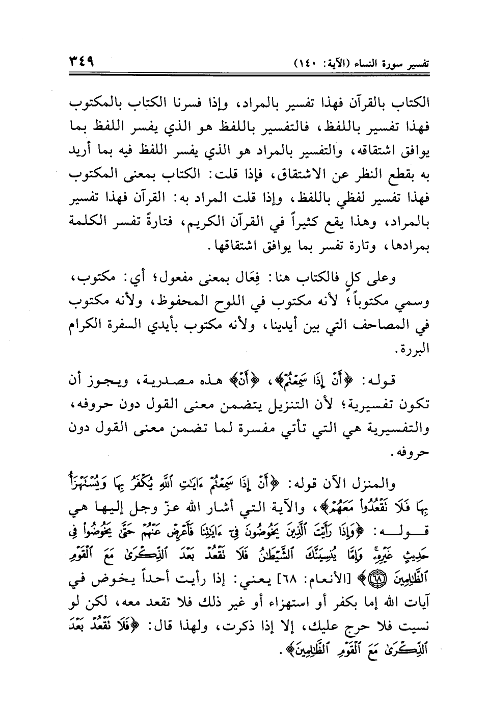 والمنزل الآن قوله: {أَنْ إِذَا سَمِعْتُمْ آيَاتِ اللَّهِ يُكْفَرُ بِهَا وَيُسْتَهْزَأُ بِهَا فَلَا تَقْعُدُوا مَعَهُمْ}، والآية التي أشار الله عزّ وجل إليها هي قوله: {وَإِذَا رَأَيْتَ الَّذِينَ يَخُوضُونَ فِي آيَاتِنَا فَأَعْرِضْ عَنْهُمْ حَتَّى يَخُوضُوا فِي حَدِيثٍ غَيْرِهِ وَإِمَّا يُنْسِيَنَّكَ الشَّيْطَانُ فَلَا تَقْعُدْ بَعْدَ الذِّكْرَى مَعَ الْقَوْمِ الظَّالِمِينَ (٦٨)} [الأنعام: ٦٨] يعني: إذا رأيت أحدًا يخوض في آيات الله إما بكفر أو استهزاء أو غير ذلك فلا تقعد معه، لكن لو نسيت فلا حرج عليك، إلا إذا ذكرت، ولهذا قال: {فَلَا تَقْعُدْ بَعْدَ الذِّكْرَى مَعَ الْقَوْمِ الظَّالِمِينَ}.