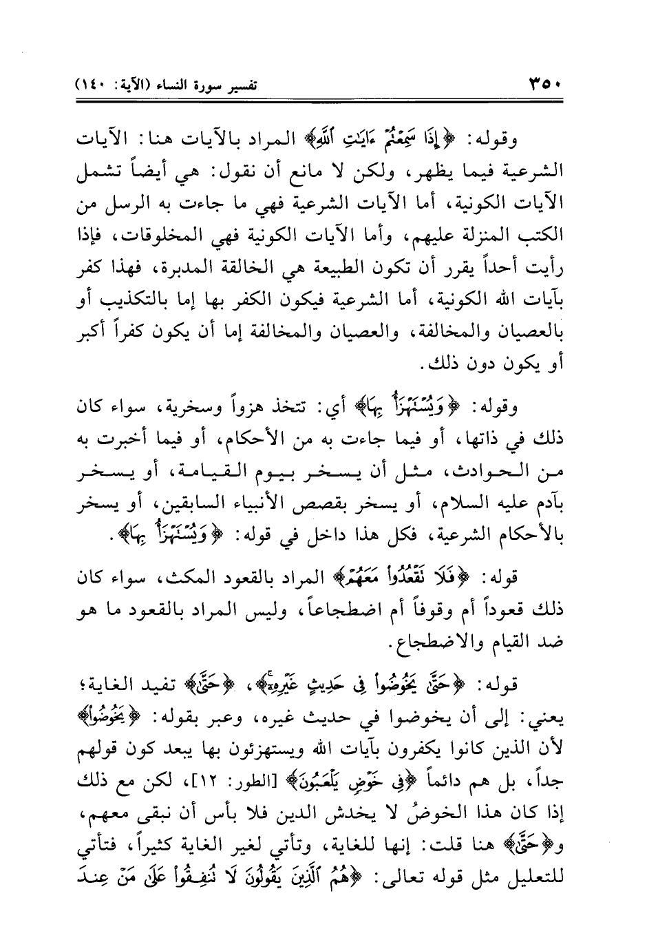 قوله: {حَتَّى يَخُوضُوا فِي حَدِيثٍ غَيْرِهِ}، {حَتَّى} تفيد الغاية؛ يعني: إلى أن يخوضوا في حديث غيره، وعبر بقوله: {يَخُوضُوا} لأن الذين كانوا يكفرون بآيات الله ويستهزئون بها يبعد كون قولهم جدًا، بل هم دائمًا {فِي خَوْضٍ يَلْعَبُونَ} [الطور: ١٢]، لكن مع ذلك إذا كان هذا الخوضُ لا يخدش الدين فلا بأس أن نبقى معهم، و {حَتَّى} هنا قلت: إنها للغاية، وتأتي لغير الغاية كثيرًا، فتأتي للتعليل مثل قوله تعالى: {هُمُ الَّذِينَ يَقُولُونَ لَا تُنْفِقُوا عَلَى مَنْ عِنْدَ