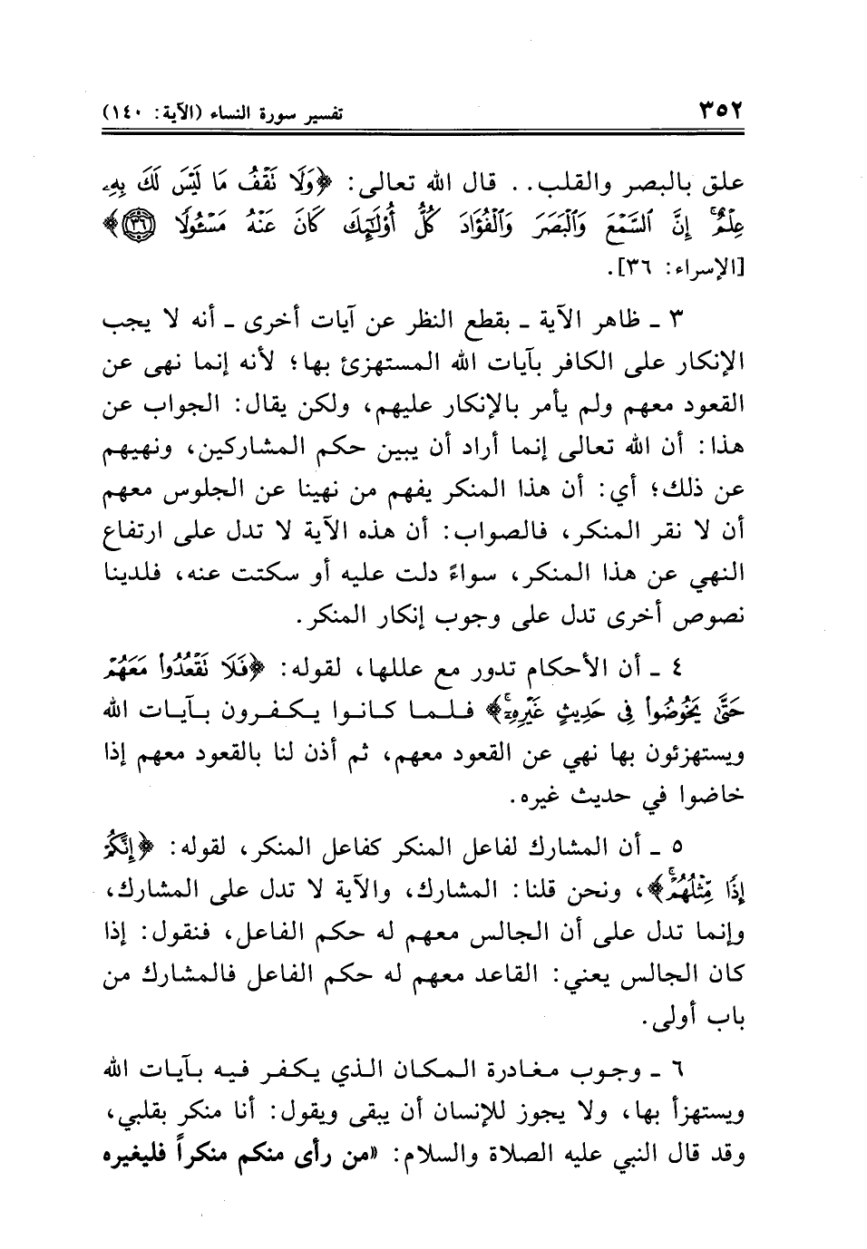 ٥ - أن المشارك لفاعل المنكر كفاعل المنكر، لقوله: {إِنَّكُمْ إِذًا مِثْلُهُمْ}، ونحن قلنا: المشارك، والآية لا تدل على المشارك، وإنما تدل على أن الجالس معهم له حكم الفاعل، فنقول: إذا كان الجالس يعني: القاعد معهم له حكم الفاعل فالمشارك من باب أولى.