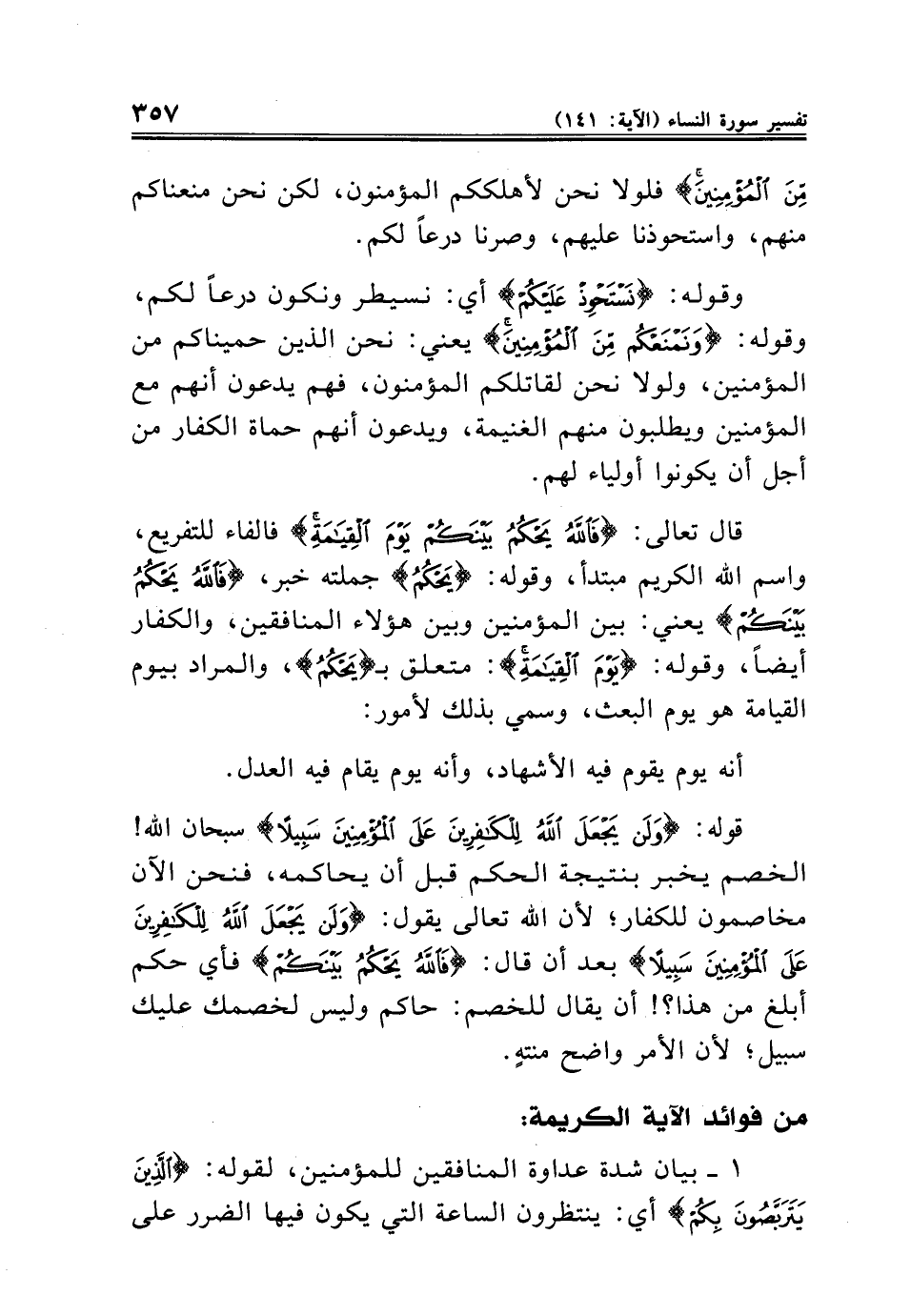 قوله: {وَلَنْ يَجْعَلَ اللَّهُ لِلْكَافِرِينَ عَلَى الْمُؤْمِنِينَ سَبِيلًا} سبحان الله! الخصم يخبر بنتيجة الحكم قبل أن يحاكمه، فنحن الآن مخاصمون للكفار؛ لأن الله تعالى يقول: {وَلَنْ يَجْعَلَ اللَّهُ لِلْكَافِرِينَ عَلَى الْمُؤْمِنِينَ سَبِيلًا} بعد أن قال: {فَاللَّهُ يَحْكُمُ بَيْنَكُمْ} فأي حكم أبلغ من هذا؟ ! أن يقال للخصم: حاكم وليس لخصمك عليك سبيل؛ لأن الأمر واضح منتهٍ.