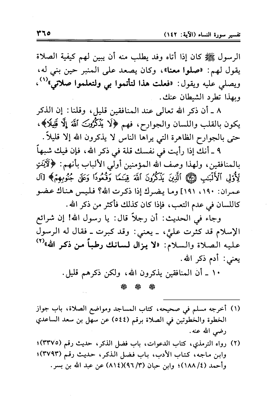 ٩ - أنك إذا رأيت في نفسك قلة في ذكر الله، فإن فيك شبهًا بالمنافقين، ولهذا وصف الله المؤمنين أولي الألباب بأنهم: {لَآيَاتٍ لِأُولِي الْأَلْبَابِ (١٩٠) الَّذِينَ يَذْكُرُونَ اللَّهَ قِيَامًا وَقُعُودًا وَعَلَى جُنُوبِهِمْ} [آل عمران: ١٩٠، ١٩١] وما يضرك إذا ذكرت الله؟ فليس هناك عضو كاللسان في عدم التعب، فإذا كان كذلك فأكثر من ذكر الله.