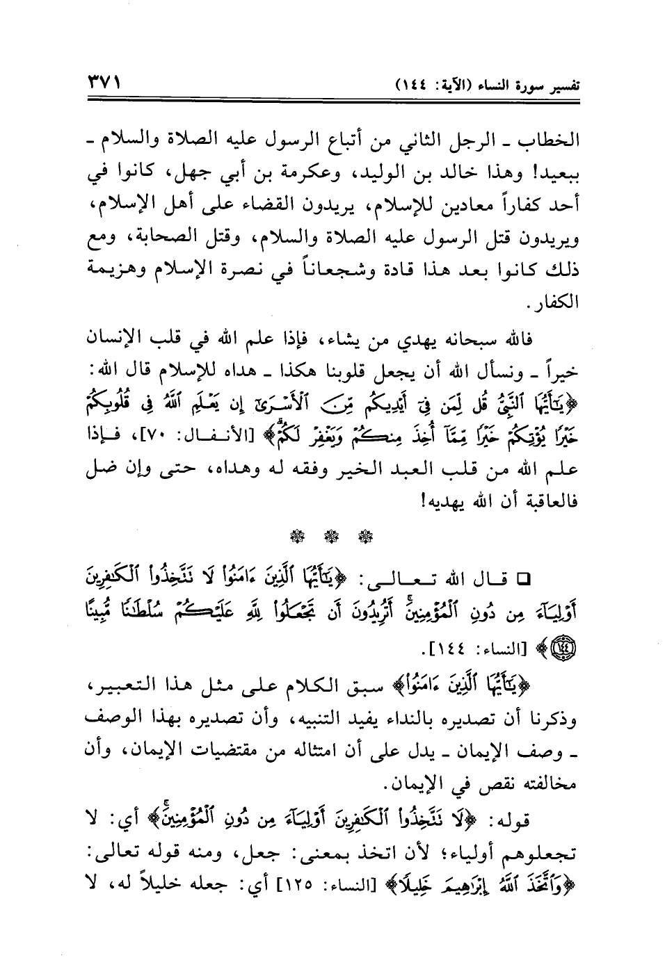 * قال الله تعالى: {يَاأَيُّهَا الَّذِينَ آمَنُوا لَا تَتَّخِذُوا الْكَافِرِينَ أَوْلِيَاءَ مِنْ دُونِ الْمُؤْمِنِينَ أَتُرِيدُونَ أَنْ تَجْعَلُوا لِلَّهِ عَلَيْكُمْ سُلْطَانًا مُبِينًا (١٤٤)} [النساء: ١٤٤].