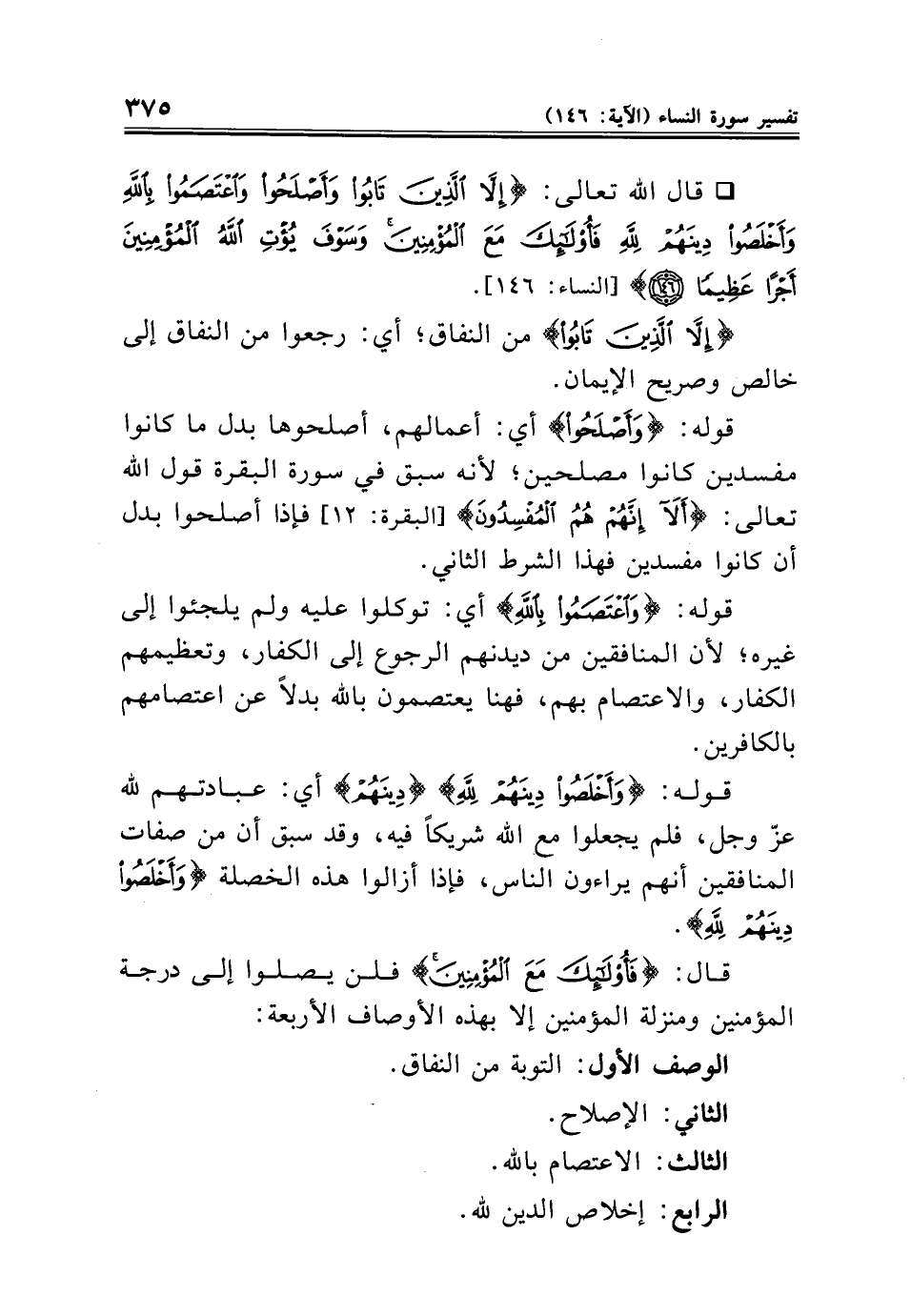 * قال الله تعالى: {إِلَّا الَّذِينَ تَابُوا وَأَصْلَحُوا وَاعْتَصَمُوا بِاللَّهِ وَأَخْلَصُوا دِينَهُمْ لِلَّهِ فَأُولَئِكَ مَعَ الْمُؤْمِنِينَ وَسَوْفَ يُؤْتِ اللَّهُ الْمُؤْمِنِينَ أَجْرًا عَظِيمًا (١٤٦)} [النساء: ١٤٦].